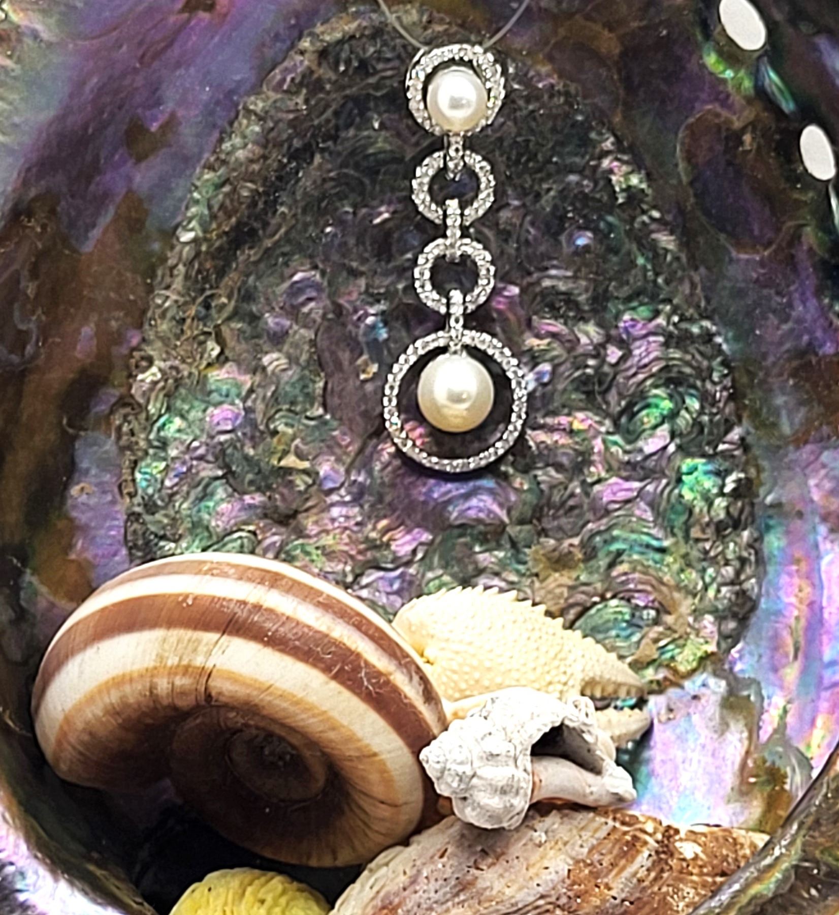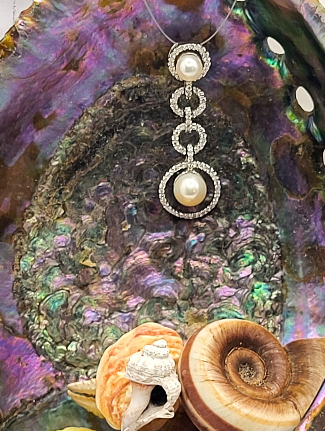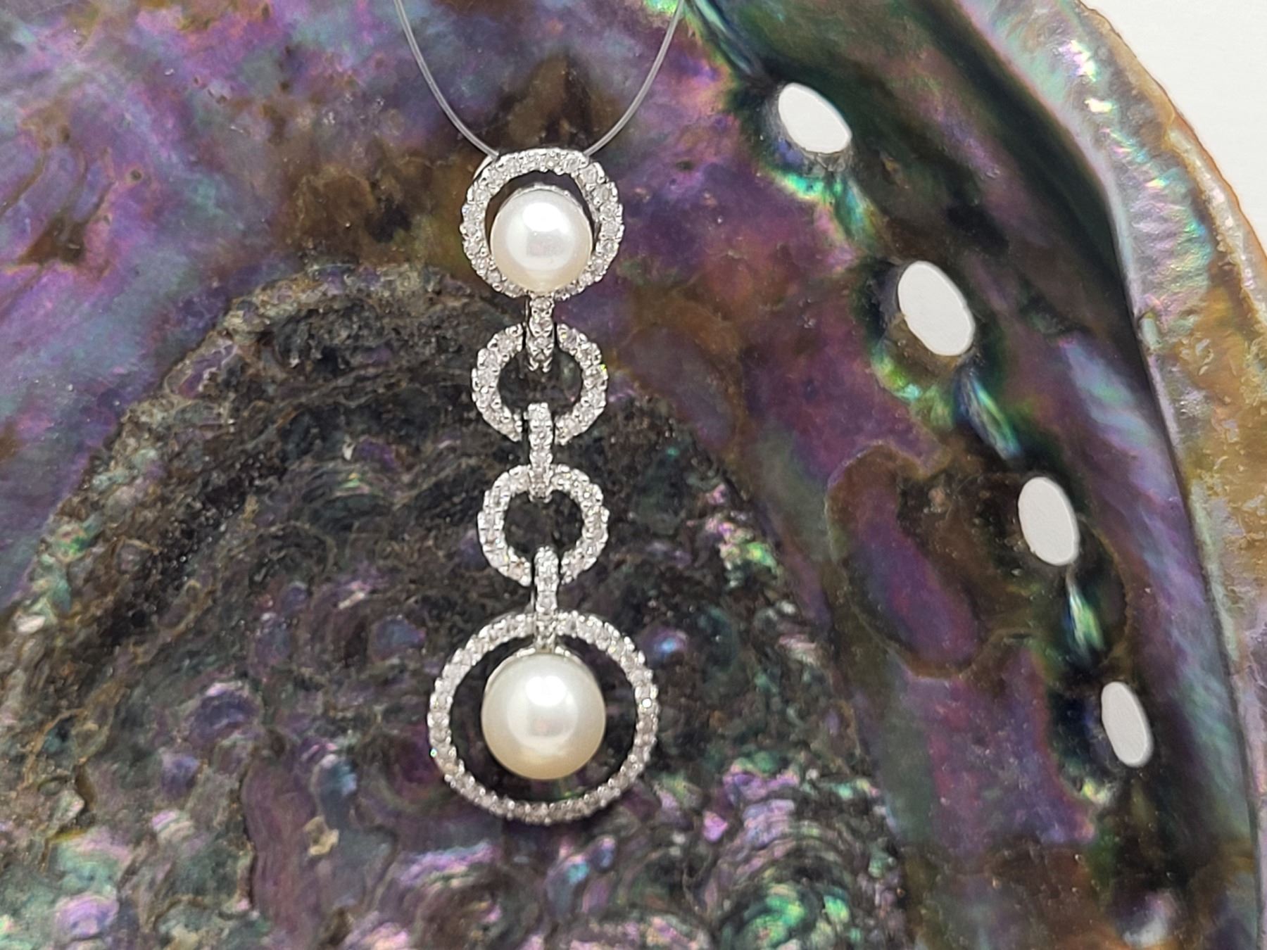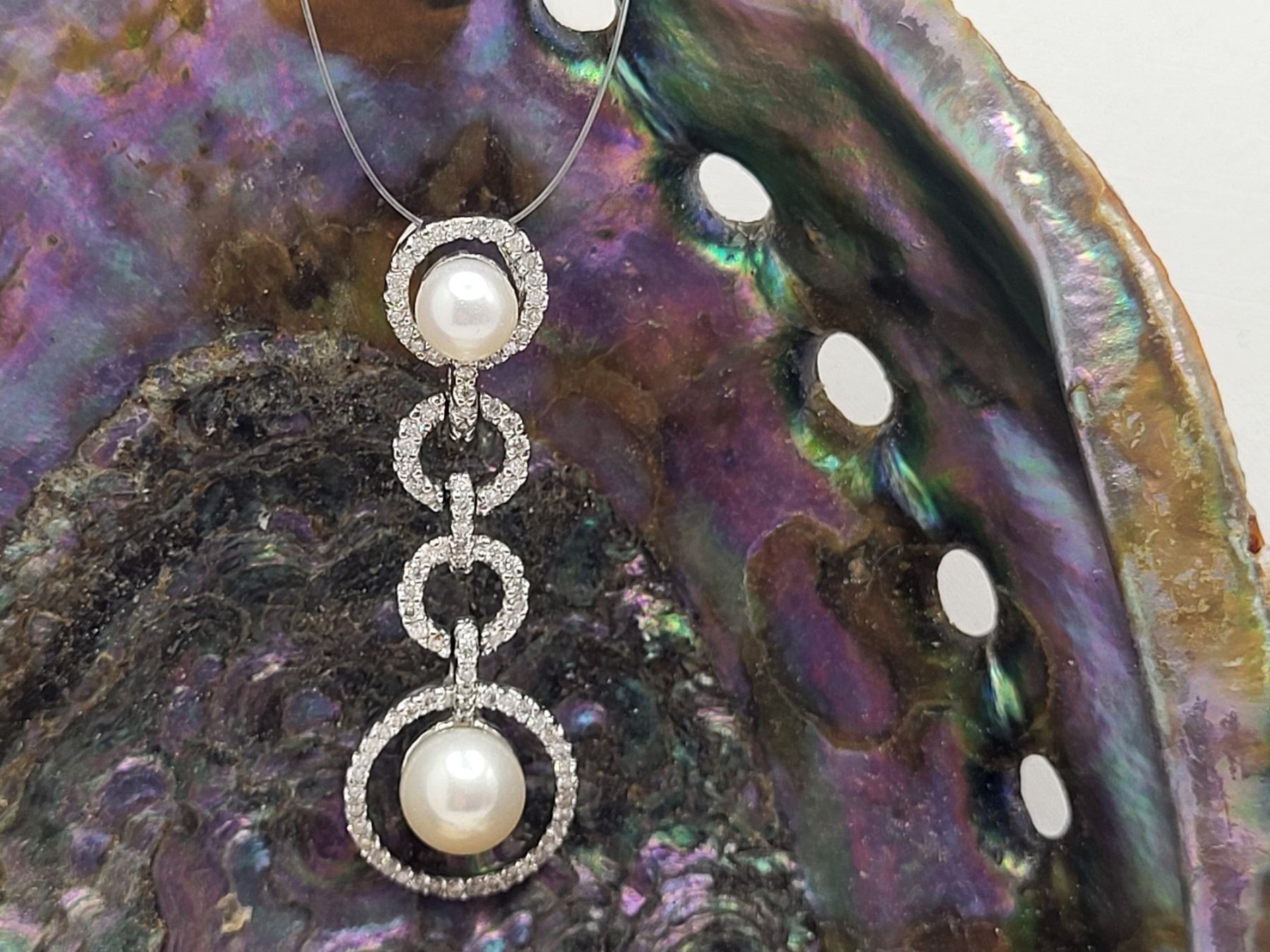 This is a 14 karat white gold pendant showcasing 2 silky cultured pearls, both having beautiful silvery and rosy sheens, and measuring 5-7mm. The pearls are secured with posts and cups and placed in the top and bottom of four circles that contain .43 carats total weight of round, brilliant-cut, H-I color, SI2-I1 clarity diamonds. The pendant is approximately 1.75& quot; long and has two (2) hidden bails to create a slide-style pendant. This item is eligible for appraisal at a discounted rate, from an independent appraiser (with qualifying credentials from GIA) with no affiliation to Bidfair Fine Jewelry. Please contact Bidfair Fine Jewelry for more information on appraisals and sizing.& nbsp; Admin: G11241/43ngt