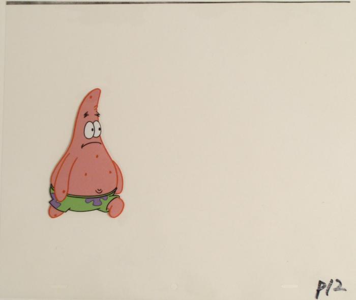 This original animation cel is from the Nickelodeon TV show SpongeBob Squarepants. The story takes place under the deep blue sea in Bikini Bottom, where SpongeBob resides. SpongeBob, who is a yellow, porous sponge, is your typical happy-go-lucky character, as he is always cheerful and enjoys making people laugh. Patrick Star, SpongeBob's neighbor who is a starfish, is your average children's show idiot, as he boasts knowing nothing and is often getting himself into ridiculous situations. Between the homes of these two lies the home of the miserable Squidward, a squid, who is known for being grouchy and playing tricks on SpongeBob and Patrick. Both SpongeBob and Squidward work at the Krusty Krab, a fast food business run by the greedy money-loving Mr. Krabs, a crab, the arch rival of the evil, possibly misunderstood, Plankton. Another neighbor, Sandy Cheeks, an athletic squirrel who normally wears an astronaut's space suit, was introduced in "Tea at the Treedome." She spends most of her time inventing and experimenting. Patrick looks concernedOriginal Production Animated Cel Overall Size of Cel: 10 1/2" x 12 1/2" Very Good ConditionThis is an original hand-painted cel set-up used in the production of an episode of "SpongeBob SquarePants." Each one-of-a-kind set-up represents a slight change in position of the characters. When individually photographed and projected in rapid succession, the images appear to move.