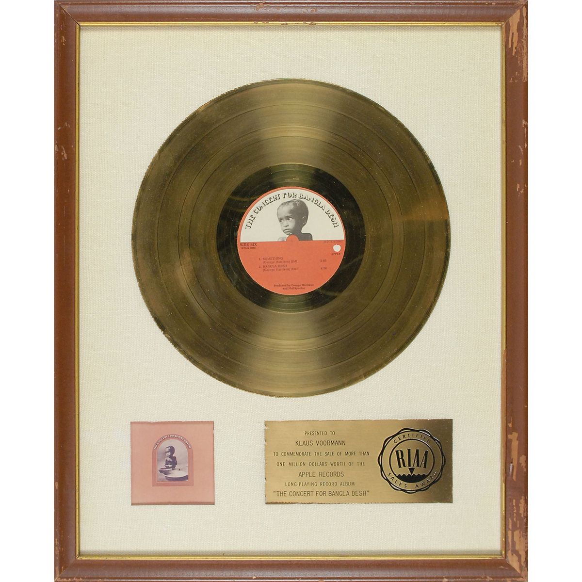 An RIAA-certified gold record award on its white linen matte, presented “to Klaus Voormann to commemorate the sale of more than one million dollars worth of the Apple Records long-playing record album ‘The Concert for Bangla Desh.’” Framed with the gold disc, engraved plaque, an image of the album cover to an overall size of 17.5 x 21.5. Appears to have been re-backed but bears an accurate New York Picture & Frame Co. sticker affixed to reverse. Scattered scuffs and dings to frame, otherwise fine condition.