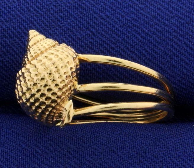 In 14k yellow gold. Detailed beautiful seashell atop three bands. Size 5 1/4. 4.9g.