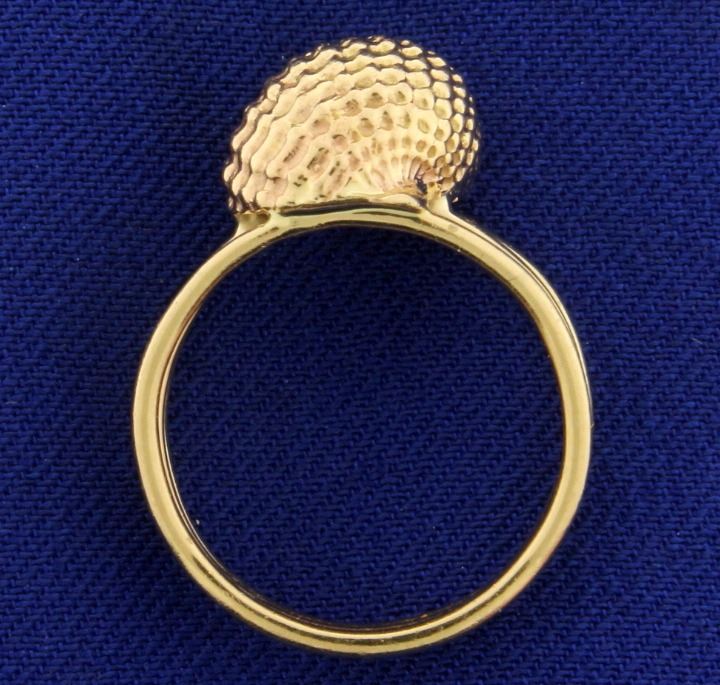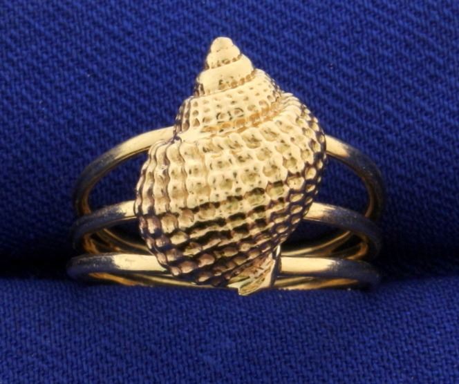 In 14k yellow gold. Detailed beautiful seashell atop three bands. Size 5 1/4. 4.9g.