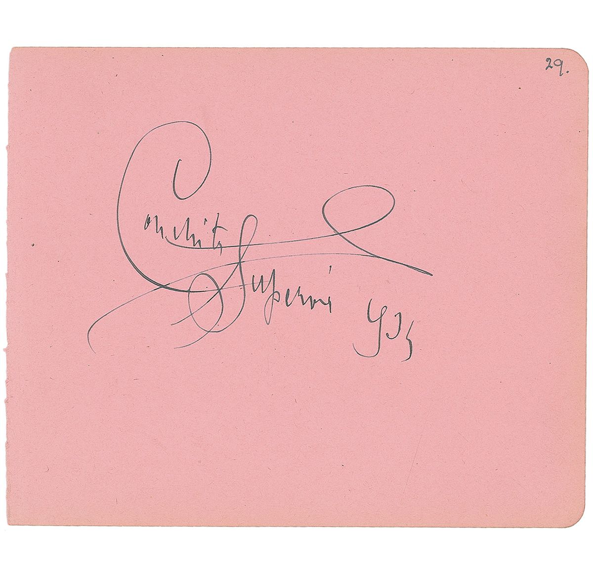Highly popular Spanish mezzo-soprano (1895–1936). Rare vintage fountain pen signature, “Conchita Supervia,” on a light pink 6.25 x 5.25 album page. In fine condition.