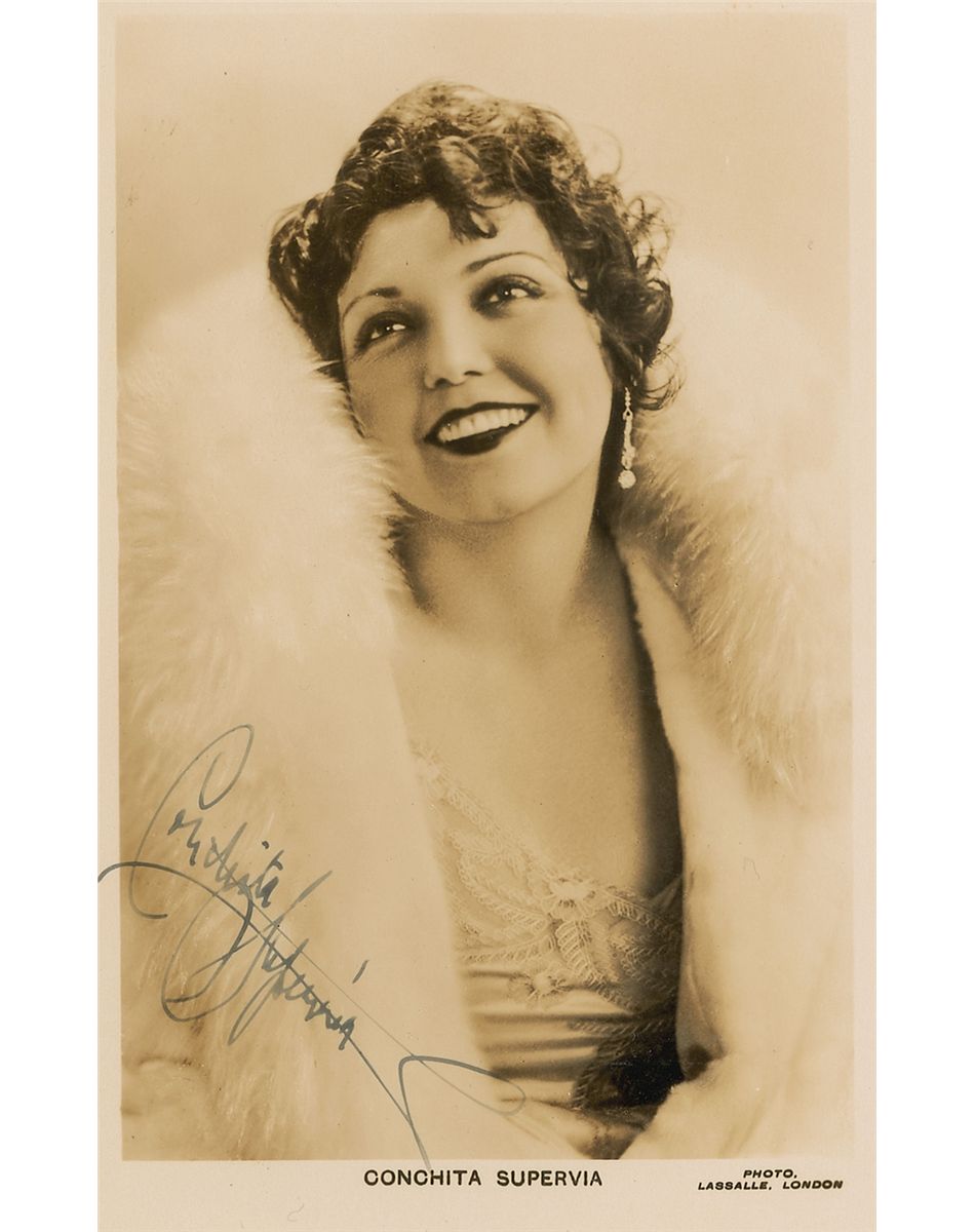 Highly popular Spanish mezzo-soprano (1895–1936). Splendid vintage glossy 3.5 x 5.5 postcard photo of Supervia, signed in fountain pen. In fine condition, with trivial soiling to the upper left.
