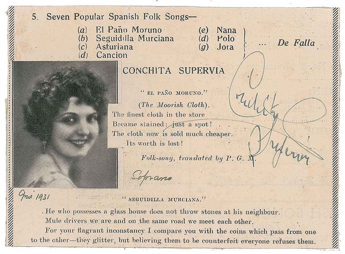 Fountain pen signature, “Conchita Supervia,” on a trimmed 5.5 x 4 magazine page with affixed portrait of the singer. The page is mounted to a same-size backing sheet. In fine condition, with light overall soiling.