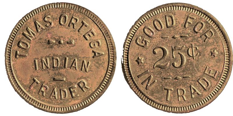 Obverse: Tomas Ortega / Indian / Trader; reverse: Good for / 25c / In Trade.BR, 25mm,R9. Fine condition, purchased from Birt in 1982.