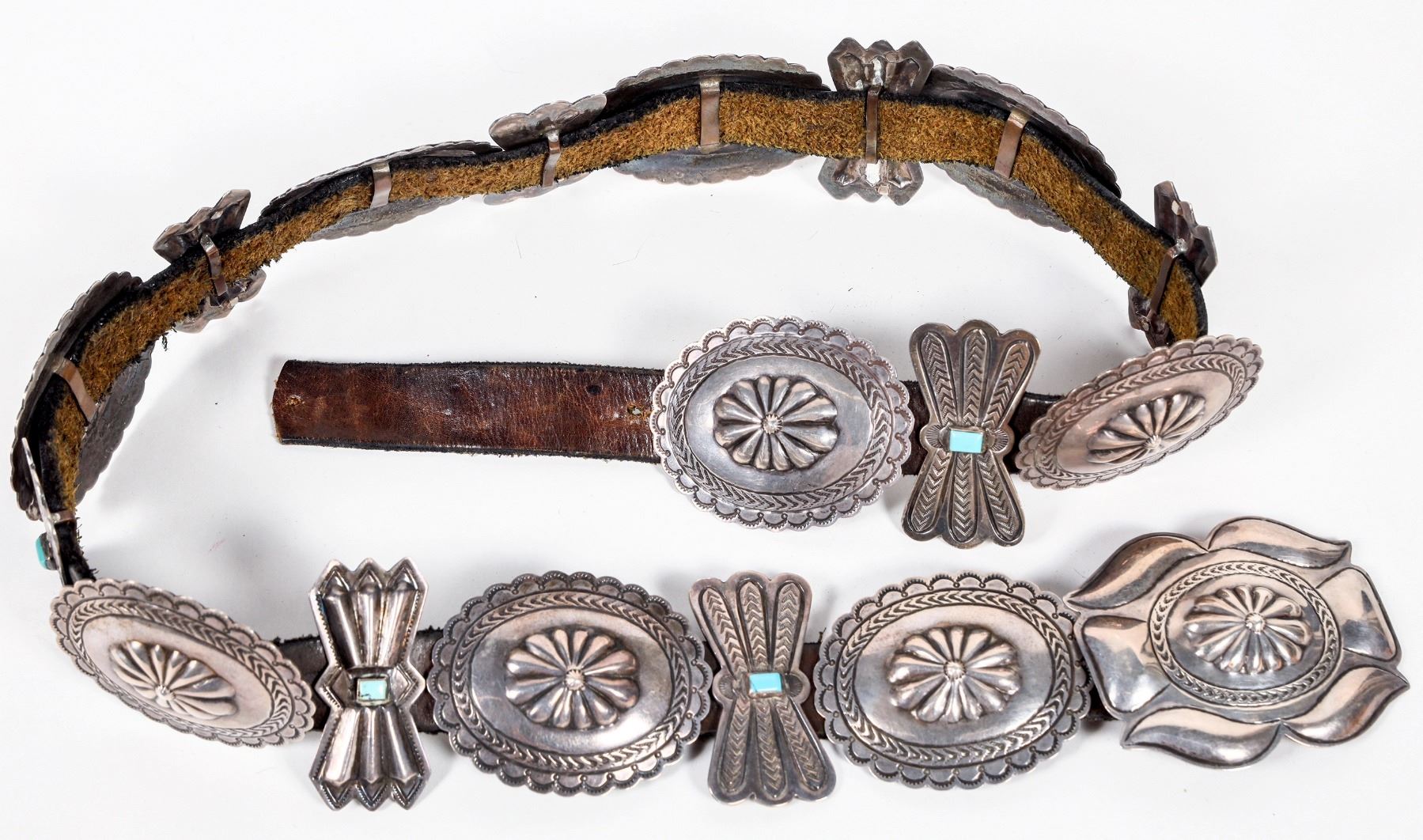 Concho belt from New Mexico trading post c1940. Belt is Native American made. Belt length measures 36" end to end including the buckle, wearable at a length of 32". Good condition, feels high quality to the touch. See photo.