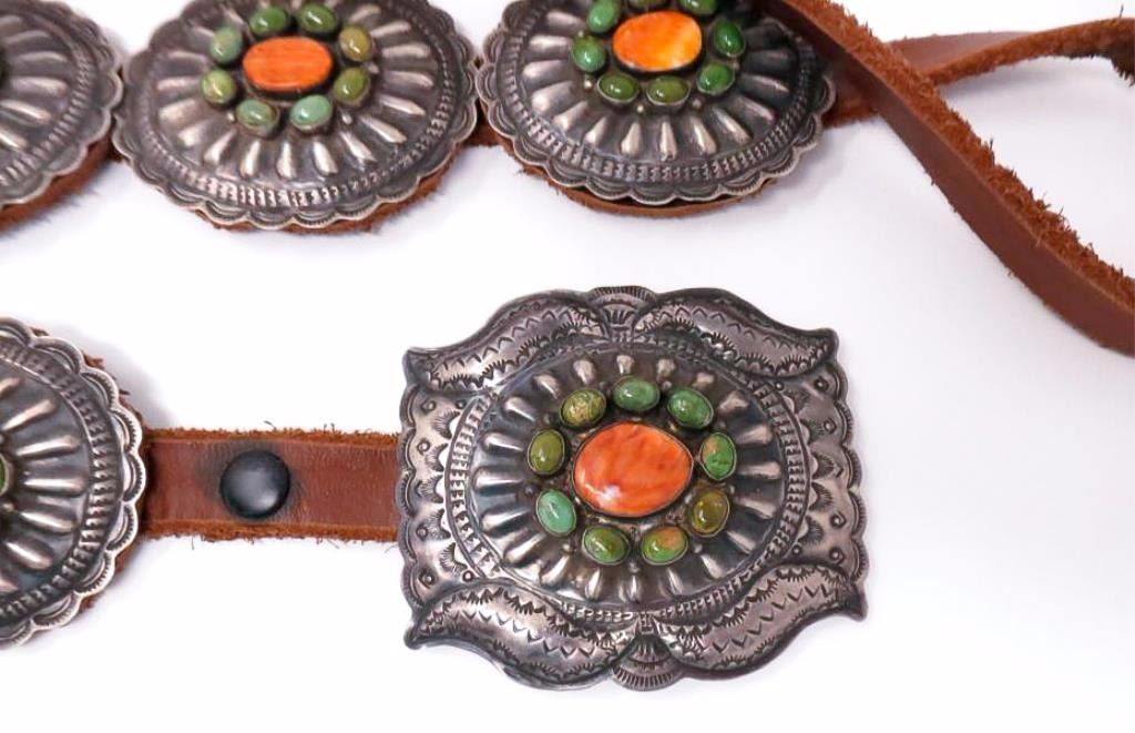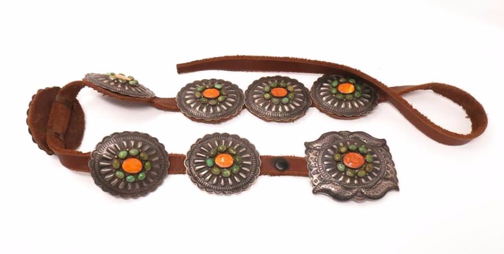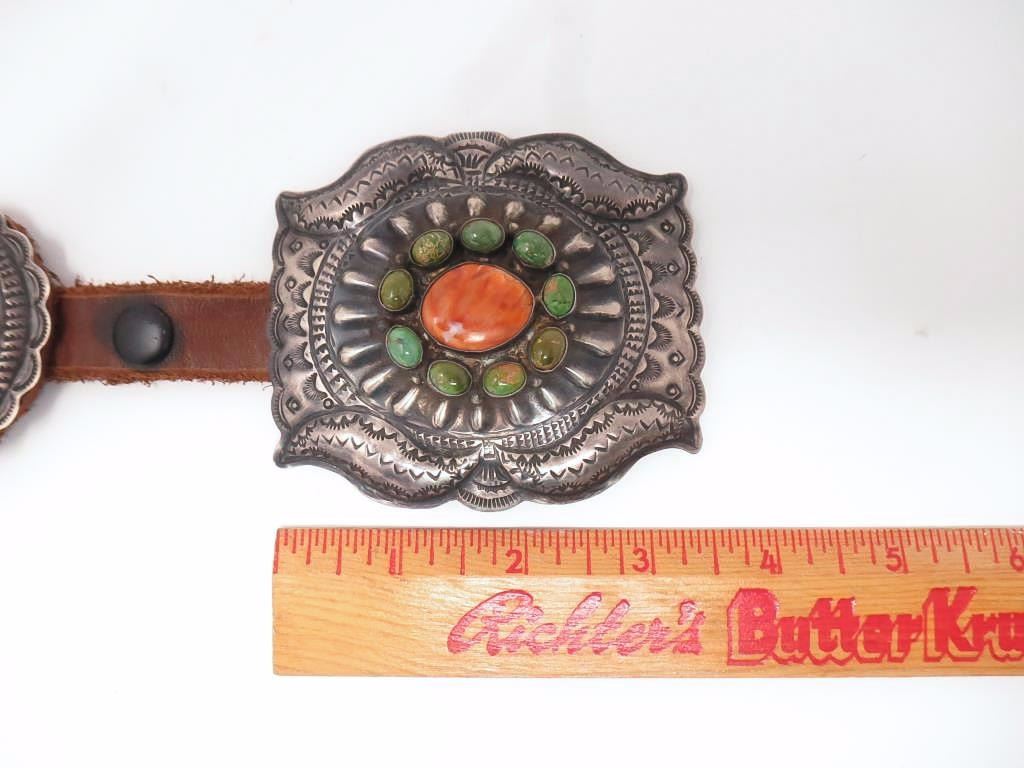Buckle and 7 silver conchos with turquoise and spiny oyster shell