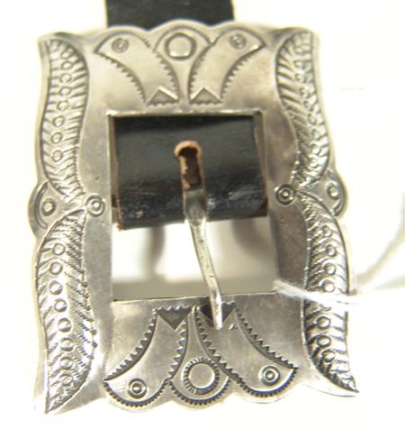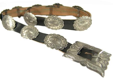 Belt with 14 hand stamped conchos plus a stamp and repoussé work buckle on leather. 36" long