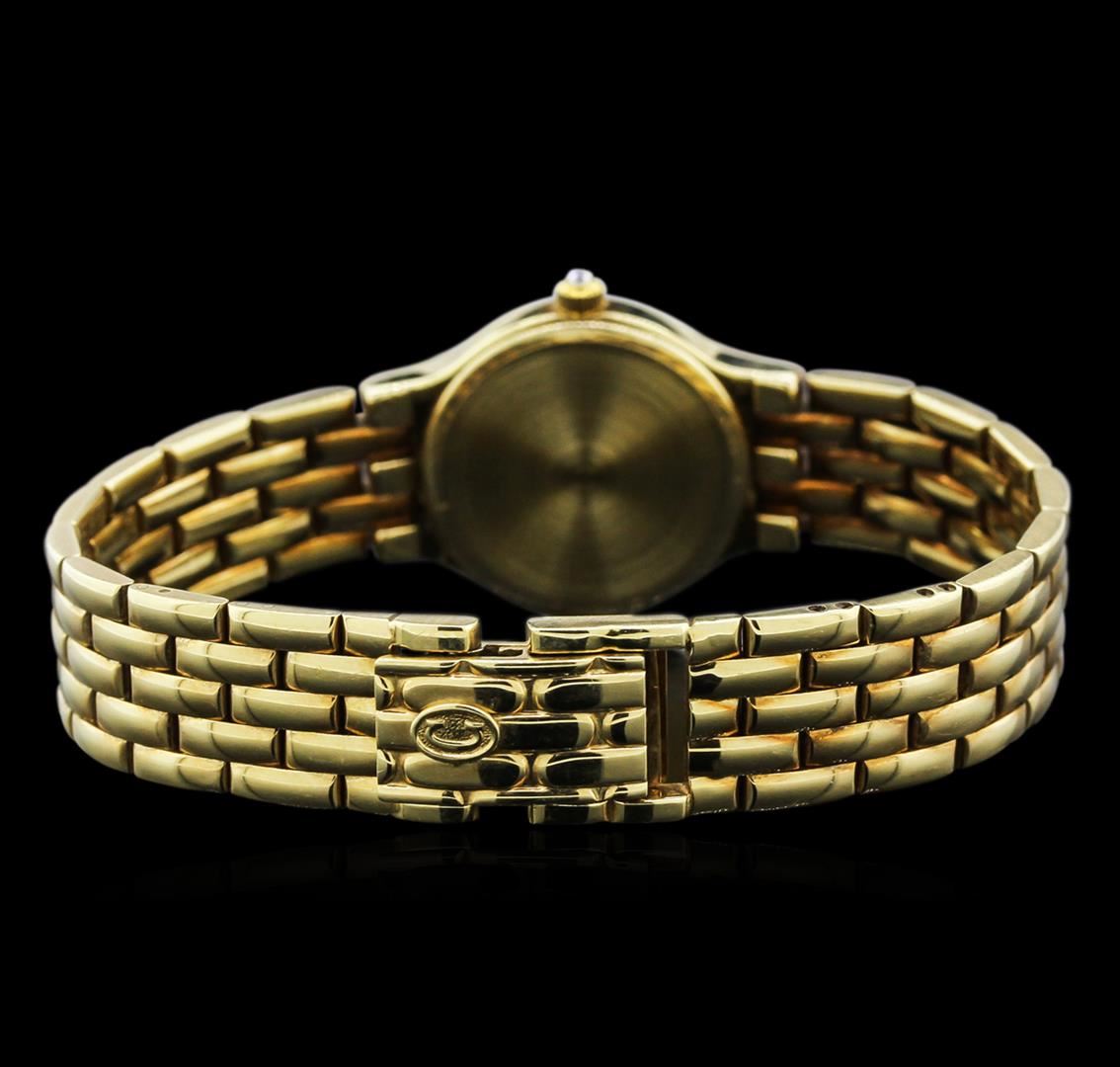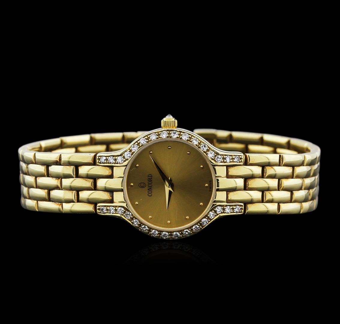 One Concord ladies wristwatch featuring: Case: 14KT yellow gold. Bezel: 14KT yellow gold diamond set. Dial: Gold tone with gold tone hour and minute hands. Bracelet/buckle: 14KT yellow gold. Total weight of watch: 44.90 grams.