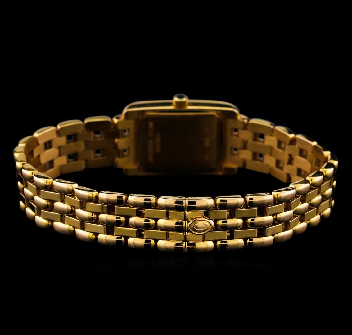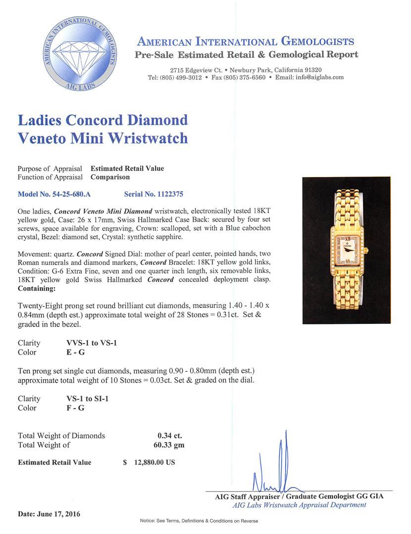 One ladies, Concord Veneto Mini Diamond wristwatch, electronically tested 18KT yellow gold, Case: 26 x 17mm, Swiss Hallmarked Case Back: secured by four set screws, space available for engraving, Crown: scalloped, set with a Blue cabochon crystal, Bezel: diamond set, Crystal: synthetic sapphire. Movement: quartz. Concord Signed Dial: mother of pearl center, pointed hands, two Roman numerals and diamond markers, Concord Bracelet: 18KT yellow gold links, Condition: G-6 Extra Fine, seven and one quarter inch length, six removable links, 18KT yellow gold Swiss Hallmarked Concord concealed deployment clasp. Containing: Twenty-Eight prong set round brilliant cut diamonds, measuring 1.40 - 1.40 x 0.84mm (depth est.) approximate total weight of 28 Stones = 0.31ct. Set & graded in the bezel. Clarity: VVS-1 to VS-1. Color: E - G Ten prong set single cut diamonds, measuring 0.90 - 0.80mm (depth est.) approximate total weight of 10 Stones = 0.03ct. Set & graded on the dial. Clarity: VS-1 to SI-1. Color: F - G. Total Weight of Diamonds 0.34ct. Total Weight of 60.33gm. AIG Appraised at $12,880.00.