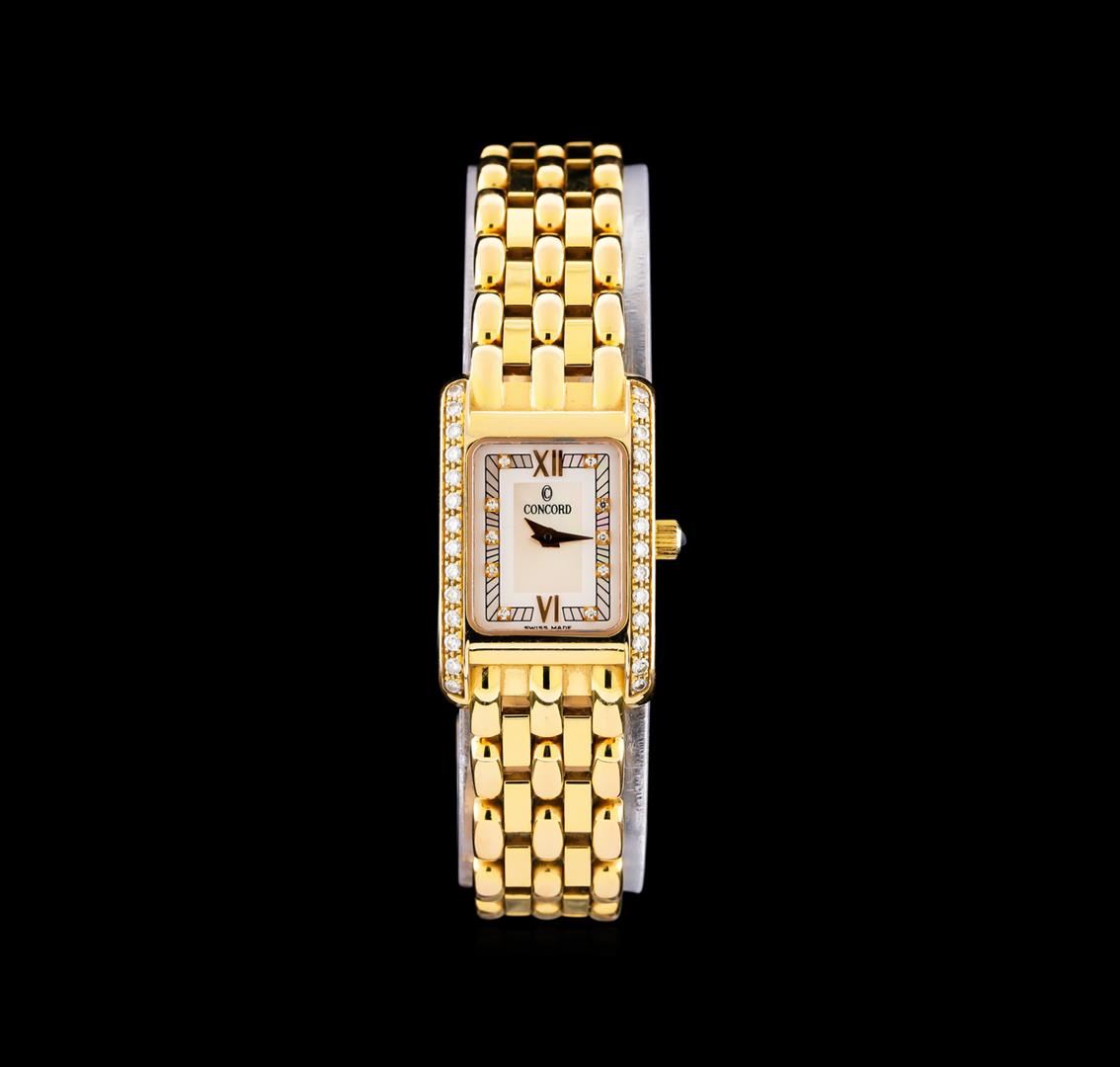 One ladies, Concord Veneto Mini Diamond wristwatch, electronically tested 18KT yellow gold, Case: 26 x 17mm, Swiss Hallmarked Case Back: secured by four set screws, space available for engraving, Crown: scalloped, set with a Blue cabochon crystal, Bezel: diamond set, Crystal: synthetic sapphire. Movement: quartz. Concord Signed Dial: mother of pearl center, pointed hands, two Roman numerals and diamond markers, Concord Bracelet: 18KT yellow gold links, Condition: G-6 Extra Fine, seven and one quarter inch length, six removable links, 18KT yellow gold Swiss Hallmarked Concord concealed deployment clasp. Containing: Twenty-Eight prong set round brilliant cut diamonds, measuring 1.40 - 1.40 x 0.84mm (depth est.) approximate total weight of 28 Stones = 0.31ct. Set & graded in the bezel. Clarity: VVS-1 to VS-1. Color: E - G Ten prong set single cut diamonds, measuring 0.90 - 0.80mm (depth est.) approximate total weight of 10 Stones = 0.03ct. Set & graded on the dial. Clarity: VS-1 to SI-1. Color: F - G. Total Weight of Diamonds 0.34ct. Total Weight of 60.33gm. AIG Appraised at $12,880.00.