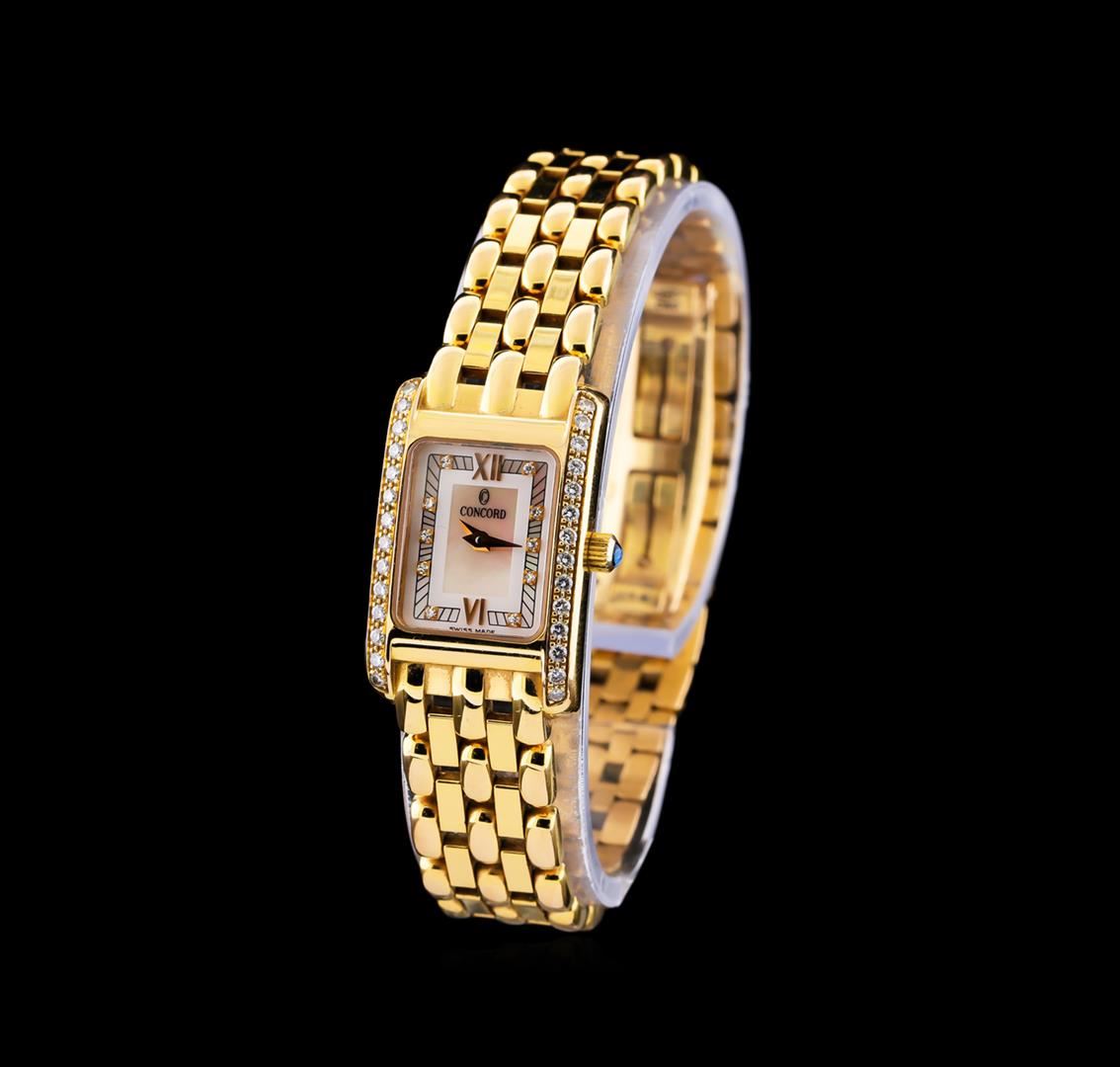 One ladies, Concord Veneto Mini Diamond wristwatch, electronically tested 18KT yellow gold, Case: 26 x 17mm, Swiss Hallmarked Case Back: secured by four set screws, space available for engraving, Crown: scalloped, set with a Blue cabochon crystal, Bezel: diamond set, Crystal: synthetic sapphire. Movement: quartz. Concord Signed Dial: mother of pearl center, pointed hands, two Roman numerals and diamond markers, Concord Bracelet: 18KT yellow gold links, Condition: G-6 Extra Fine, seven and one quarter inch length, six removable links, 18KT yellow gold Swiss Hallmarked Concord concealed deployment clasp. Containing: Twenty-Eight prong set round brilliant cut diamonds, measuring 1.40 - 1.40 x 0.84mm (depth est.) approximate total weight of 28 Stones = 0.31ct. Set & graded in the bezel. Clarity: VVS-1 to VS-1. Color: E - G Ten prong set single cut diamonds, measuring 0.90 - 0.80mm (depth est.) approximate total weight of 10 Stones = 0.03ct. Set & graded on the dial. Clarity: VS-1 to SI-1. Color: F - G. Total Weight of Diamonds 0.34ct. Total Weight of 60.33gm. AIG Appraised at $12,880.00.