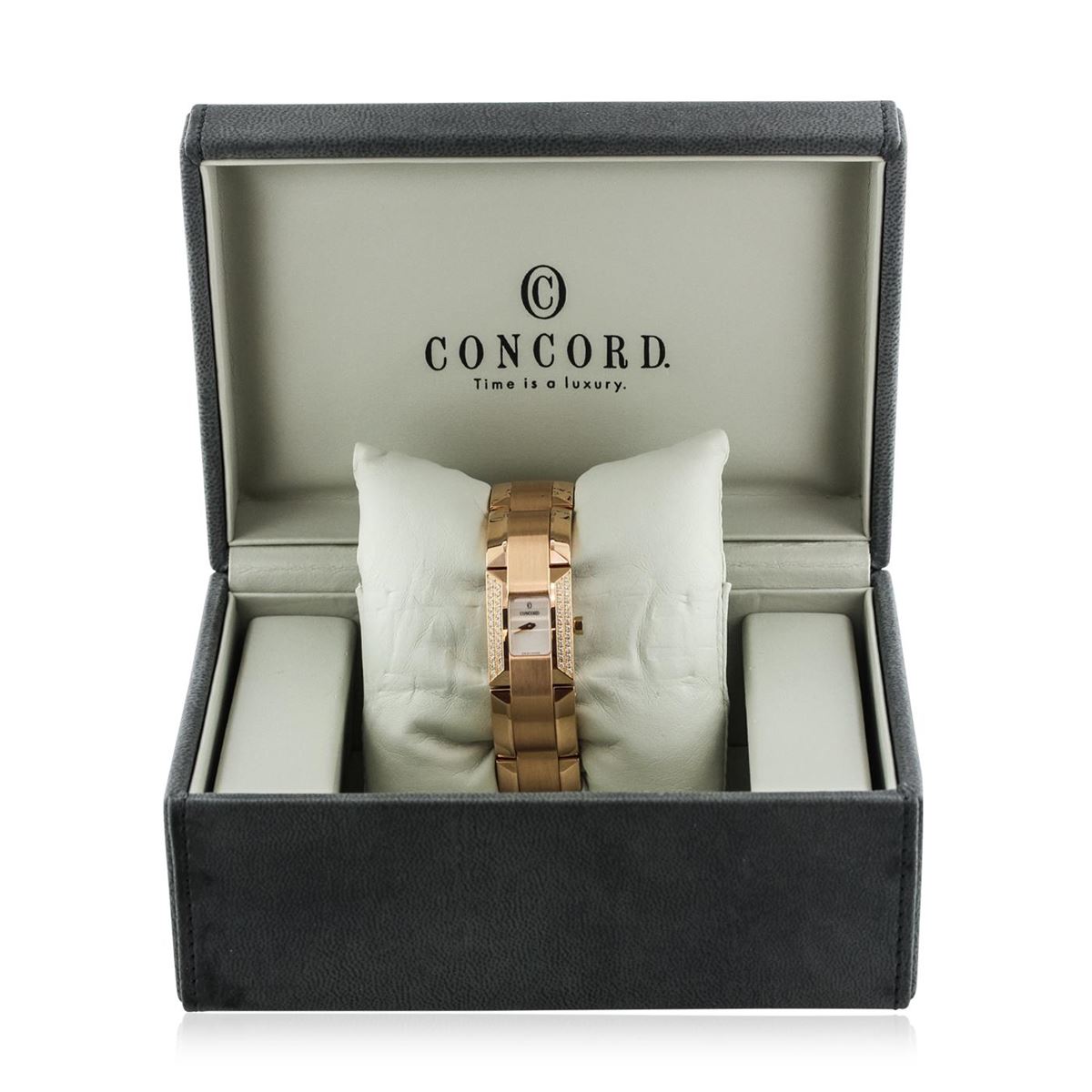 One ladies, Concord La Scala wristwatch, Retro inspired, electronically tested 18KT rose gold, Rectangular Case: 25 x 18mm, Case Back: engraved with the manufacturers name, and ID numbers, Case Lugs: interconnected to the case, Bezel: diamond set, Crystal: synthetic sapphire. Movement: Swiss Quartz. Dial: mother of pearl, pointed hands, and Concord signed, Bracelet: 18K rose gold La Scala links, Condition: G-6 Extra Fine. Bright polish & satin finish. Seven inch length. Three removable links. Concealed deployment clasp, with logo. Containing: Fifty two round brilliant cut diamonds approximate. Total Weight of 52 Stones = 0.30ct. Graded in the setting. Clarity: VVS-2 to VS-1 Color E - G Total Weight of Diamonds 0.30ct. Total Weight of Watch102.00 grams. AIG Appraised at $17,440.00.