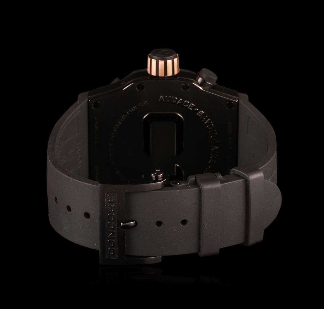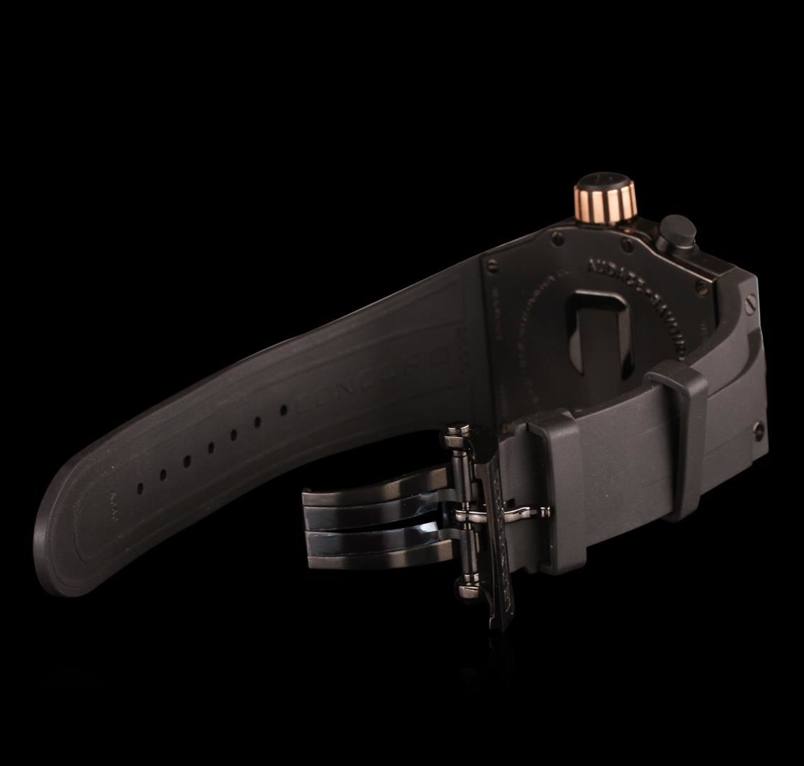 100% AUTHENTIC , Brand New In Box, Unworn WITH ALL ORIGINAL PACKAGING AND DOCUMENTATIONS; Case: 18 k rose gold, stainless steel, rubber' Case-back: Screw-down; Bezel: 18 k rose gold, rubber; Dial: Black; Hands: Rose Gold-tone luminescent; Markers: Rose Gold tone luminescent; Functions: Three hand, date; Calendar: Date at 3 o'clock; Calendar Date, Second Timekeeping, Three Hand, Water Resistant; Clasp: Double-folding with push button; Crystal: Scratch-resistant Sapphire; Crown: Screw-down; Movement: Swiss Mechanical Automatic; Water resistance: 20 ATM/200 meters/660 feet; Case measurements: 47 mm wide x 46 mm long x 14 mm thick; Band measurements: 31 mm wide x 8 inches long; Model: 0320049. Also comes with personal Concord USB memory plug with combination lock protection.