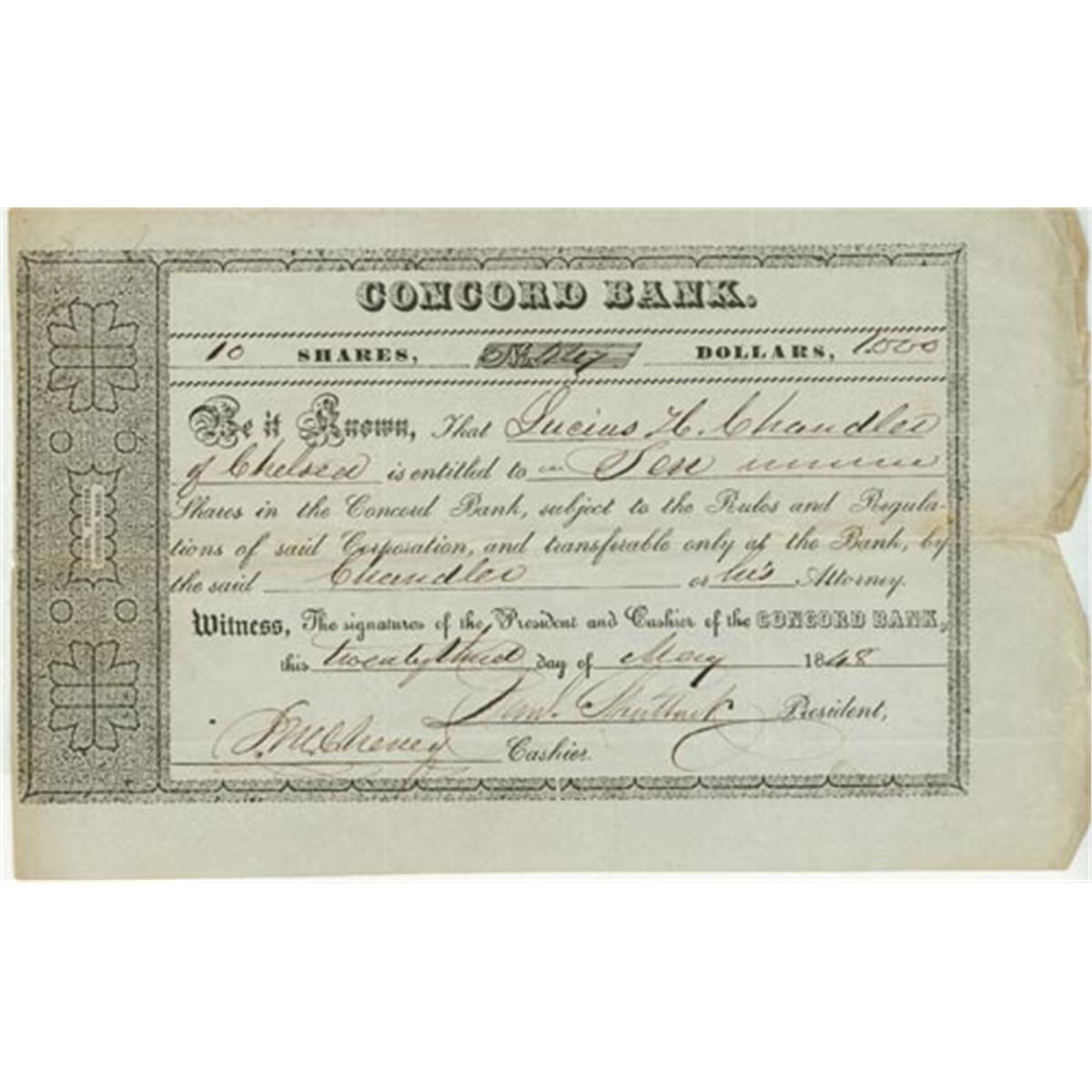 1848, Massachusetts. Stock certificate for 10 shares. Black on blue paper.