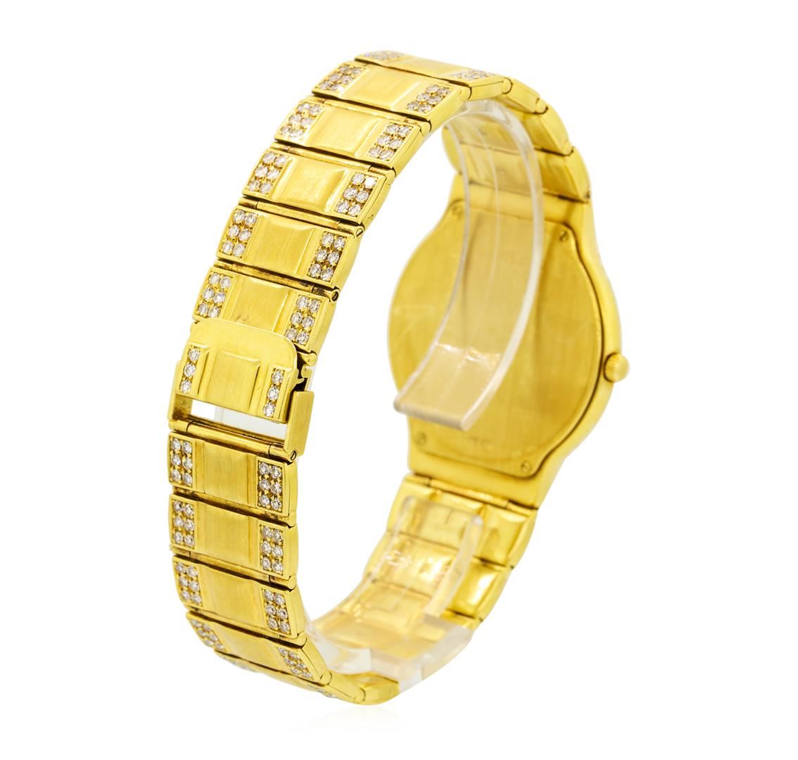 One, Concord La Scala wristwatch, electro-chemically tested 18KT Yellow gold. Case: 31mm diameter, Swiss hallmarked Case Back: engraved with the manufacturers ID numbers, there is space available for personalized engraving, Low Profile Crown: scalloped, Bezel: diamond set, Crystal: synthetic sapphire.Movement: quartz. Concord Signed Dial: pattern continuation, pointed hands, Concord Bracelet: 18KT Yellow gold La Scala links, Condition: G-6 Extra Fine. Bright polish & brushed finish, Seven inch length. Containing: Approximately Five Hundred Twenty Eight single cut diamonds approximate total weight of Stones = 5.00ct. Graded in the setting.Clarity VVS-1 to VS-1 Color E - GTotal Weight of Diamonds 5.00ct. Total Weight of Watch 58.71gm. AIG Appraised at $14,880.00.