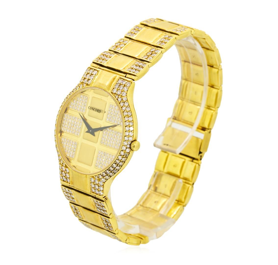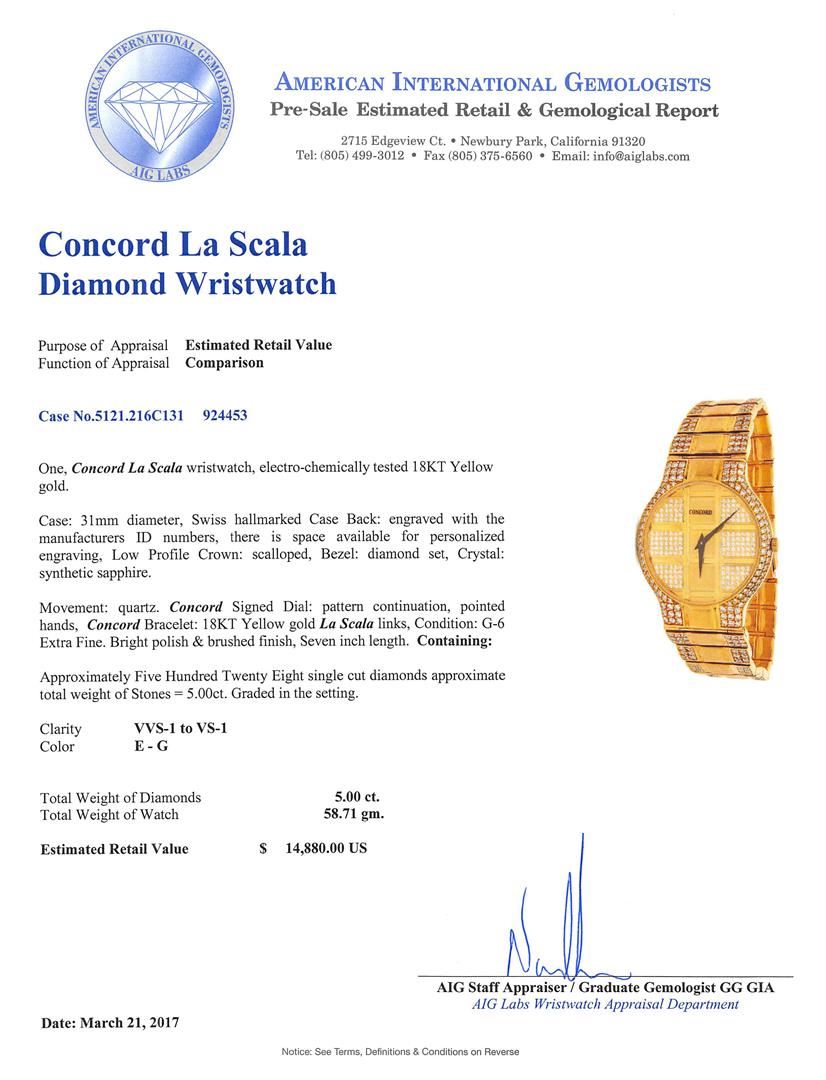 One, Concord La Scala wristwatch, electro-chemically tested 18KT Yellow gold. Case: 31mm diameter, Swiss hallmarked Case Back: engraved with the manufacturers ID numbers, there is space available for personalized engraving, Low Profile Crown: scalloped, Bezel: diamond set, Crystal: synthetic sapphire.Movement: quartz. Concord Signed Dial: pattern continuation, pointed hands, Concord Bracelet: 18KT Yellow gold La Scala links, Condition: G-6 Extra Fine. Bright polish & brushed finish, Seven inch length. Containing: Approximately Five Hundred Twenty Eight single cut diamonds approximate total weight of Stones = 5.00ct. Graded in the setting.Clarity VVS-1 to VS-1 Color E - GTotal Weight of Diamonds 5.00ct. Total Weight of Watch 58.71gm. AIG Appraised at $14,880.00.