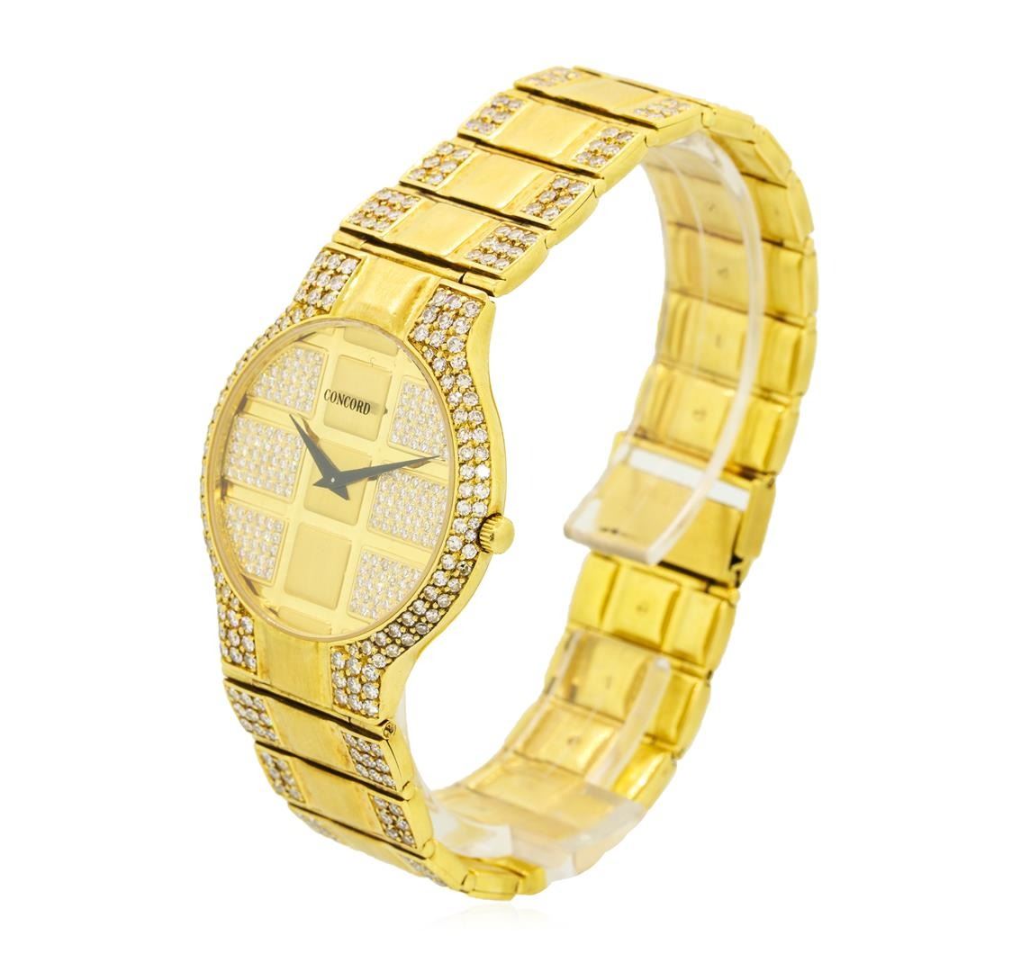 One, Concord La Scala wristwatch, electro-chemically tested 18KT Yellow gold. Case: 31mm diameter, Swiss hallmarked Case Back: engraved with the manufacturers ID numbers, there is space available for personalized engraving, Low Profile Crown: scalloped, Bezel: diamond set, Crystal: synthetic sapphire.Movement: quartz. Concord Signed Dial: pattern continuation, pointed hands, Concord Bracelet: 18KT Yellow gold La Scala links, Condition: G-6 Extra Fine. Bright polish & brushed finish, Seven inch length. Containing: Approximately Five Hundred Twenty Eight single cut diamonds approximate total weight of Stones = 5.00ct. Graded in the setting.Clarity VVS-1 to VS-1 Color E - GTotal Weight of Diamonds 5.00ct. Total Weight of Watch 58.71gm. AIG Appraised.