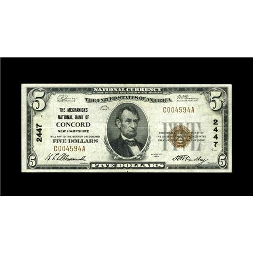 <B>Concord, NH</B></I> - $5 1929 Ty. 1 <B>The Mechanicks NB</B></I> Ch. # 2447<BR>Although the census from here now extends to a seemingly available 36 1929 series notes, just six of them are of this type and denomination, including this bright and attractive <B>Very Fine+</B></I> example.
