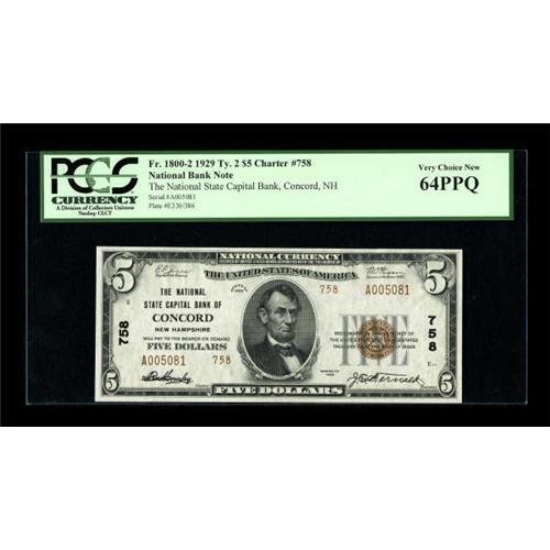 <B>Concord, NH</B></I> - $5 1929 Ty. 2 <B>The National State Capital Bank</B></I> Ch. # 758<BR> A gorgeous example with bold embossing and excellent centering from this always in demand state capital bank. New Hampshire notes are scarce as a whole, and this high grade state capital example should prove extremely popular. <B>PCGS Very Choice New 64PPQ</B></I>.<BR><BR><b>Shipping:</b> Coins & Currency (<a target="_blank" href="http://www.heritageauctions.com/common/shipping.php">view shipping information</a>)
