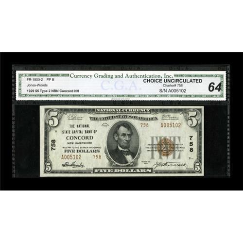 <B>Concord, NH</B></I> - $5 1929 Ty. 2 <B>The National State Capital Bank</B></I> Ch. # 758<BR> Tonight we offer yet another opportunity to acquire a pleasing New Hampshire capital note. Lovely original surfaces can be seen beneath the holder. <B>CGA Choice Uncirculated 64</B></I>.<BR><BR><b>Shipping:</b> Coins & Currency (<a target="_blank" href="http://www.heritageauctions.com/common/shipping.php">view shipping information</a>)