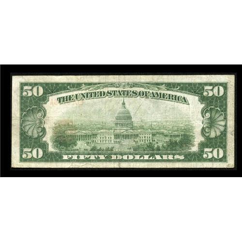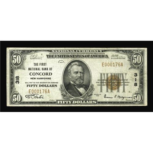<B>Concord, NH</B></I> - $50 1929 Ty. 1 <B>The First NB</B></I> Ch. # 318<BR>An excessively rare New Hampshire note, as this denomination was issued by only two banks in the state, both, coincidentally, located in Concord. Just nine such examples are listed in the new Kelly census, with seven coming from the other issuer and only two coming from the First NB. Of the two known, one is listed with out a grade, indicating its long absence from the market, while the other is lower grade than the specimen we now offer. <B>Very Fine,</B></I> a note that is likely to be fiercely fought over.