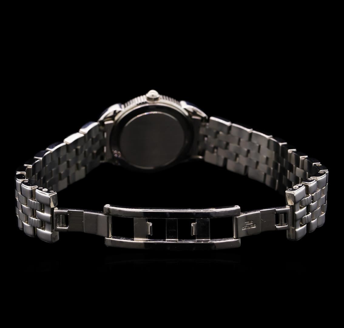 One ladies, Concord Impresario wristwatch, electronically tested Stainless Steel, Case: 25mm diameter, Case Back: space available for engraving, Case Sides: vertical scalloped pattern, Crown: scalloped pattern continuation, Bezel: diamond set, Crystal: synthetic sapphire. Movement: quartz. Concord Signed Dial: Light Ivory color, pointed hands, Roman numerals and diamond markers, Date Window: 3 o'clock position, Concord Bracelet: Stainless Steel links, Condition: G-6 Extra Fine. Bright polish & scalloped pattern continuation, six and three quarter inch length. Two removable links. Concealed deployment clasp. Containing: Thirty Six round brilliant cut diamonds approximate total weight of 36 Stones = 0.34ct. Graded in the setting. Clarity: VVS-2 to VS-1 Color F - G. Total Weight of Diamonds 0.34ct. Total Weight of Watch 58.71gm. AIG Appraised at $2,650.00.