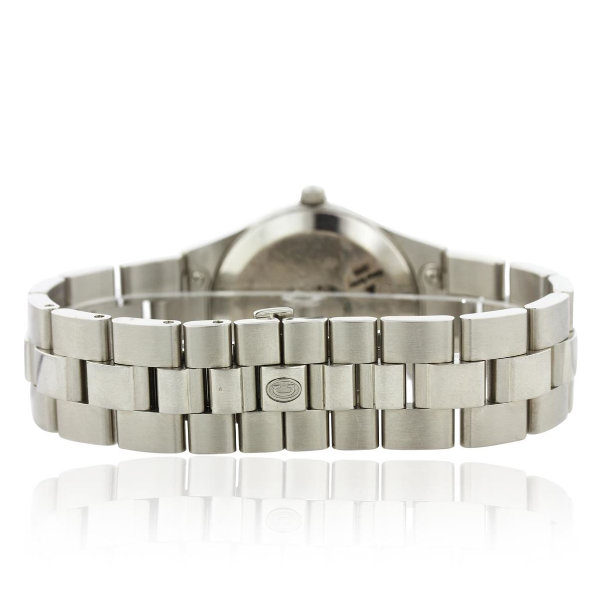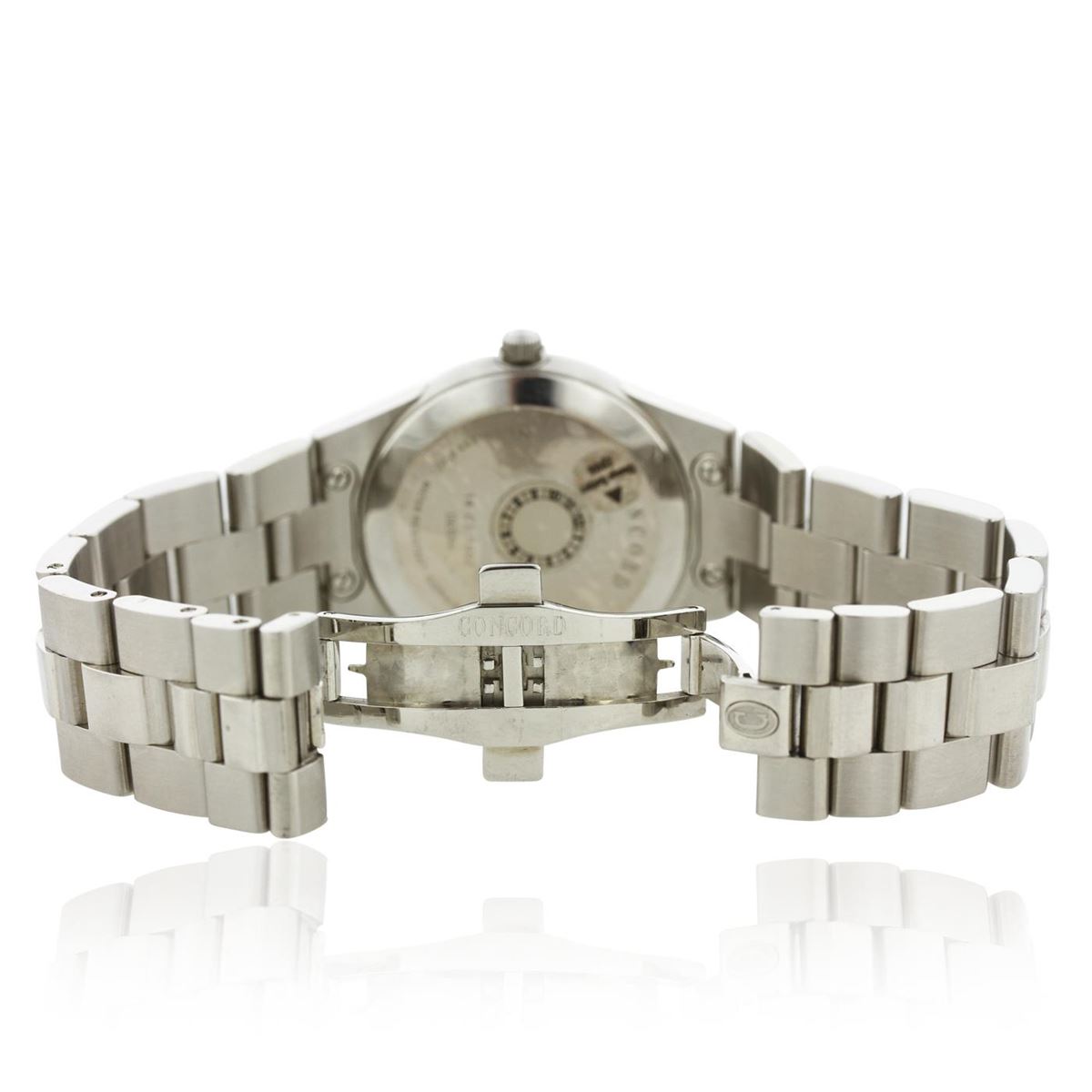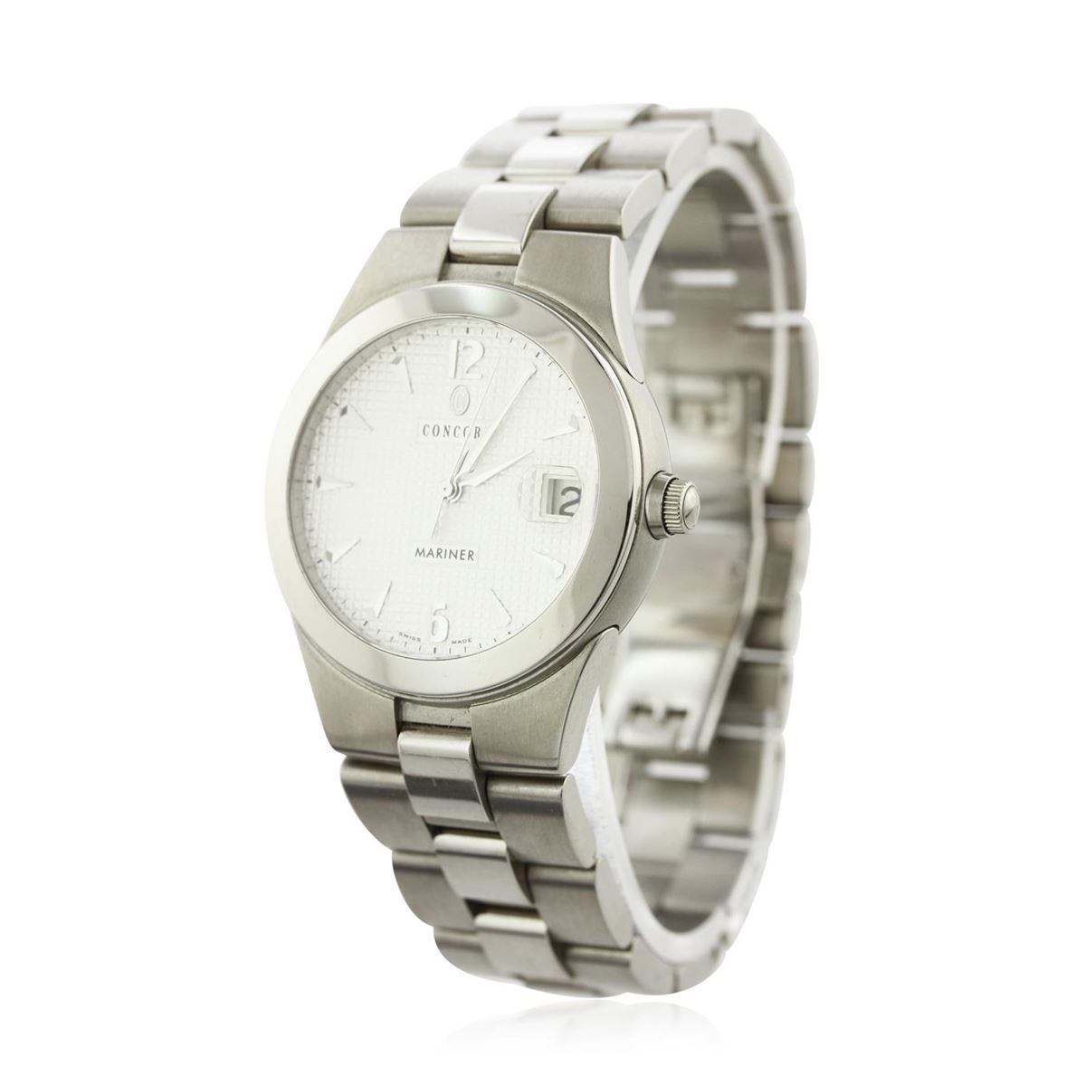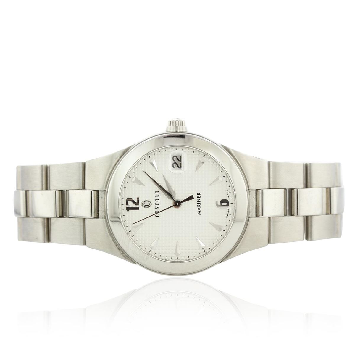 One gents Concord Mariner Dress Wristwatch featuring: Stainless Steel 7.75'' Bracelet, Crown, Case, 36mm Bezel, and Lugs, White Dial with Analog Display, magnified date at 3 o'clock position, White tone hour, minute, and second hands, Arabic Numerals 12 and 6, white tone markers at other hour positions except for 3, Swiss Movement, Water Resistant, Sapphire Crystal, Push Button Deployment Clasp.