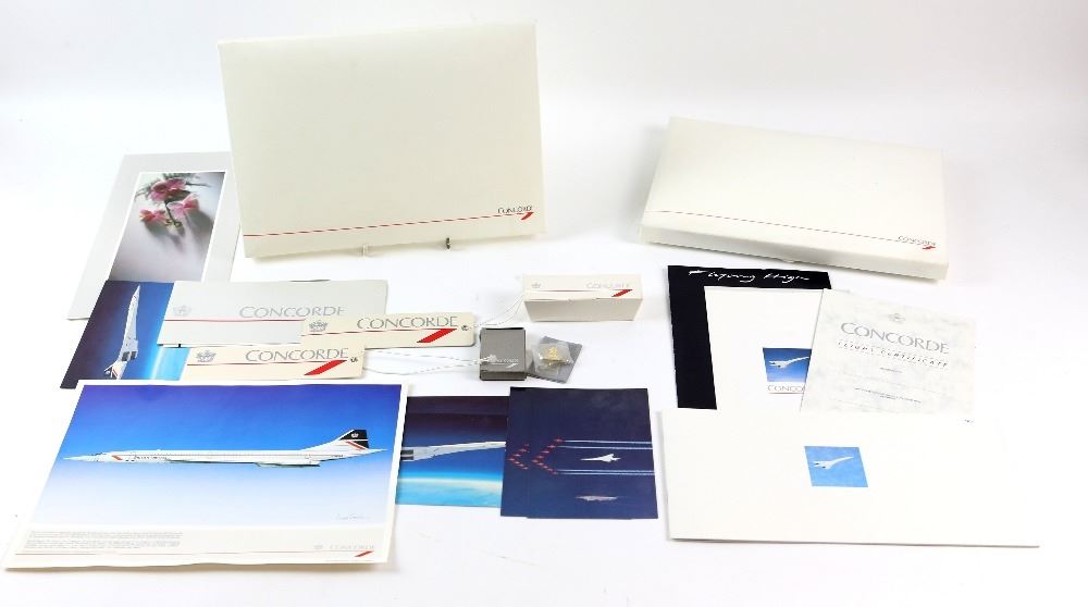Concorde memorabilia of two folders including tickets, flight certificate, brochure, print, empty ch