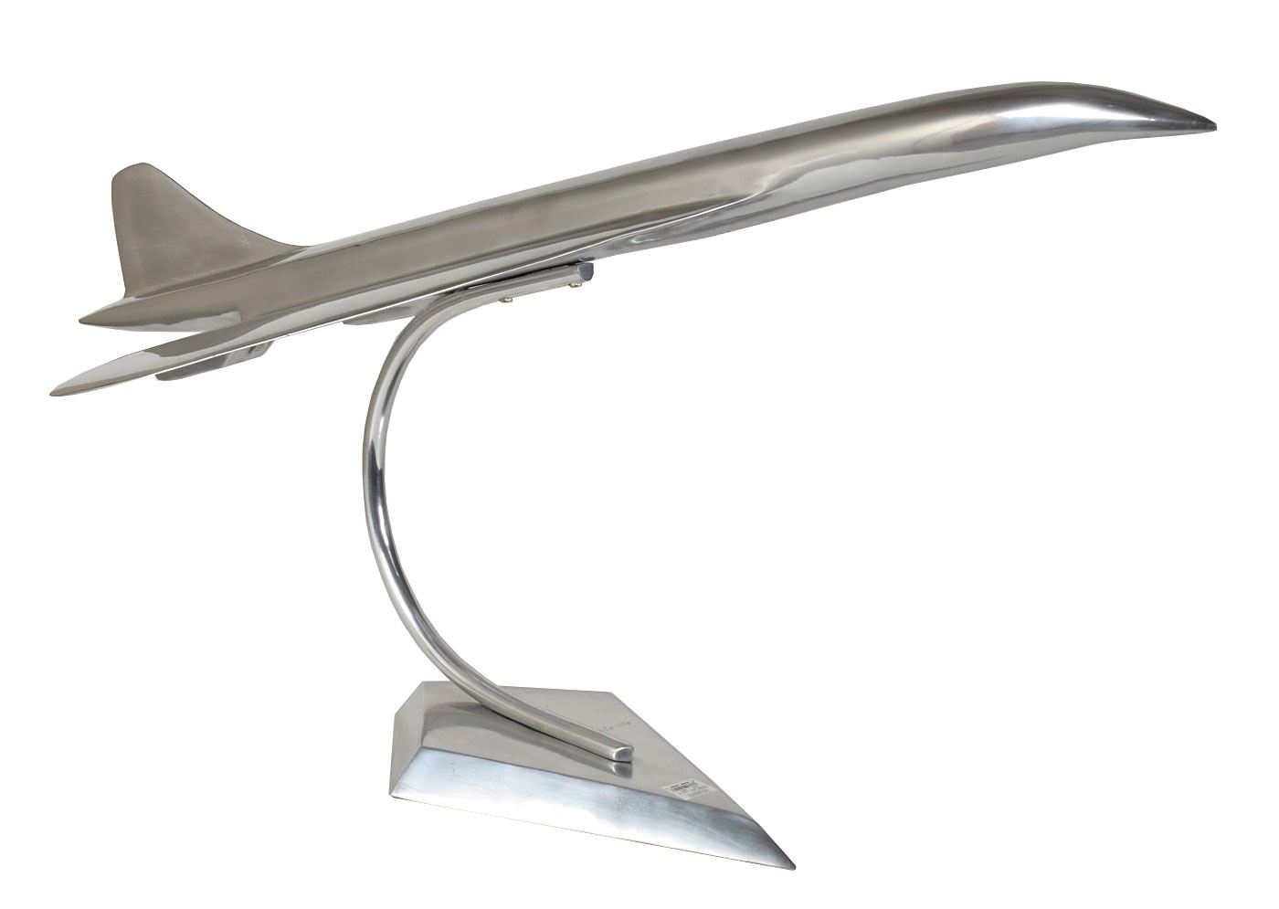 Sleek model of the supersonic Concorde jet crafted from polished aluminum, made by Restoration Hardware, measuring approximately 45 x 22 x 18 and weighing 30 pounds. In fine condition.