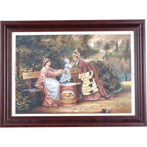 Condensed Milk paper advertising sign c1900 showing 2 women & child framed 17" x 23"