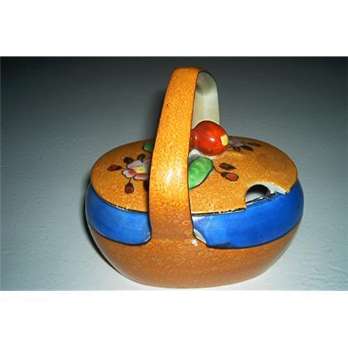 I am featuring at todays auction a beautiful condiment covered dish with the Bookmark #25 - Made By SEIEI And Company. Before World War II and Closed in 1962. Bottom stamped in red: Handpainted-Made In Japan. This is not a reproduction. Main colors are: Orange & Blue. The lid is painted with red, yellow, and green flowers,leaves and nuts. This condiment set also contains a tiny silver spoon with "Happy Anniversary" inscribed. Lovely orange handle attached.. All three pieces are in Mint Condition. Measurements are: 5 inches long and 4 inches wide. Stands (with handle) 5 1/4 inches tall. Depth measures 2 inches.