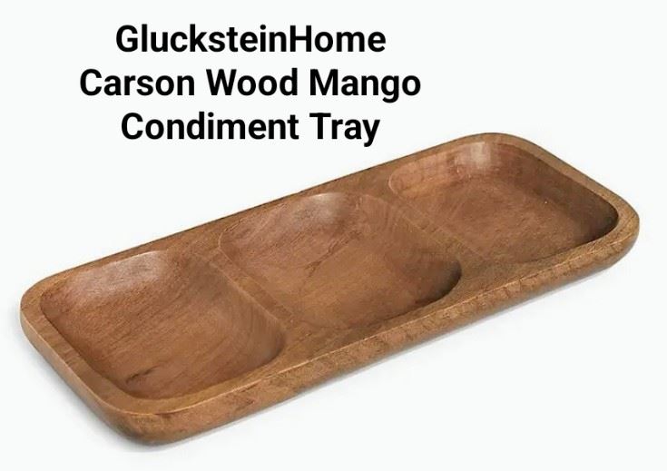 Carved from mango wood, features three compartments for serving dips and sauces, new.
