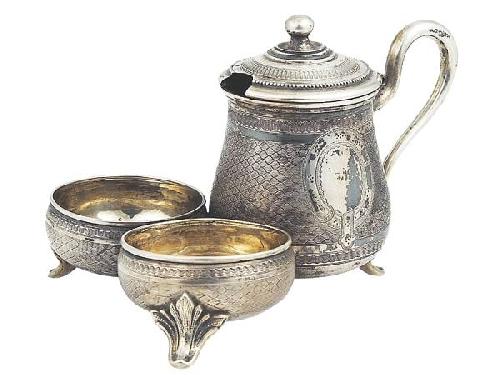 Silver, 98 g. Condiment holders attached to each other with mustard holder, raised on three feet. On the surface there is guilloche decoration. The glass linings are missing. Marked: 800 purity, Austrian import mark between 1872 and 1902 Size: 8.5 cm
