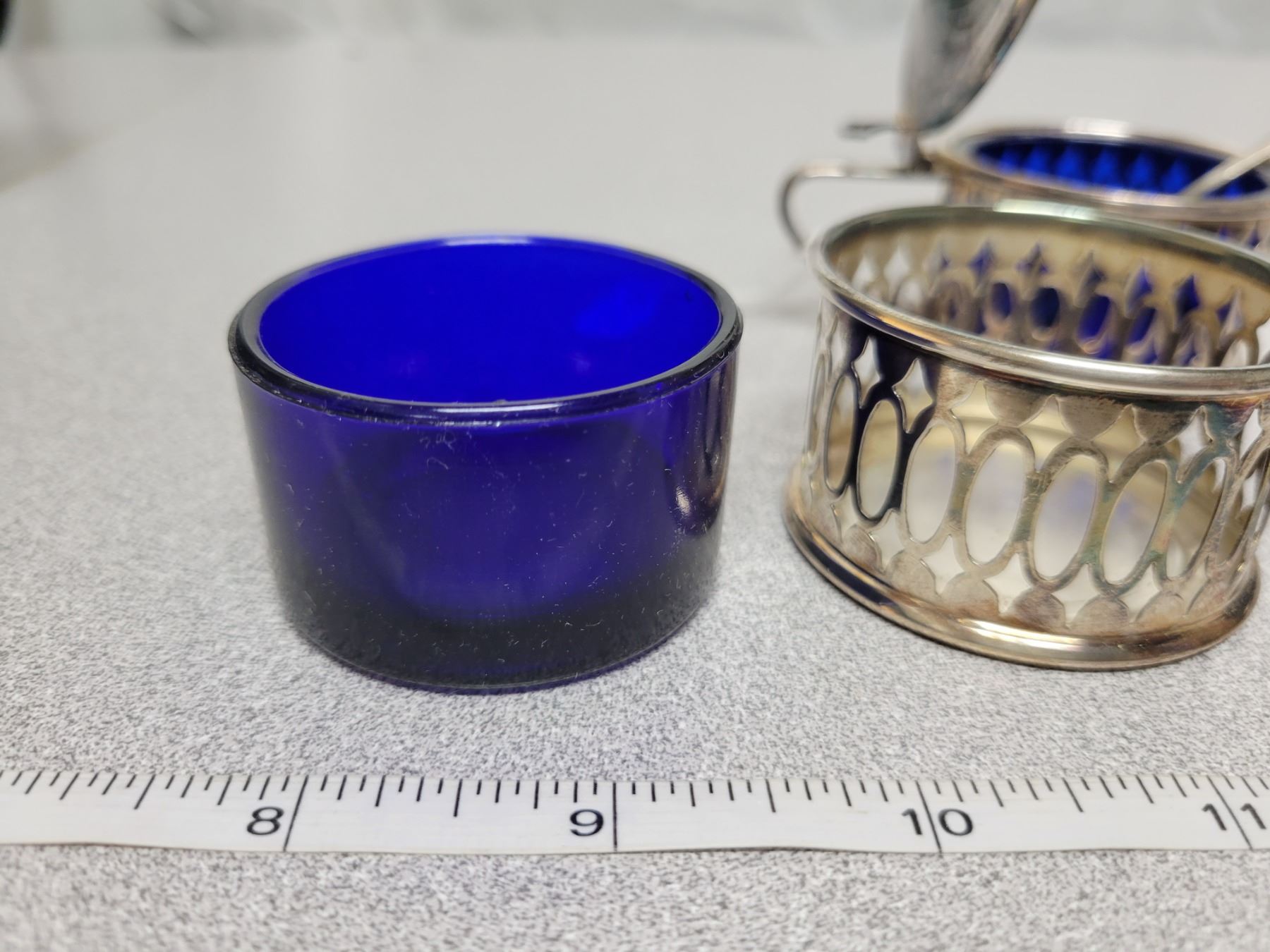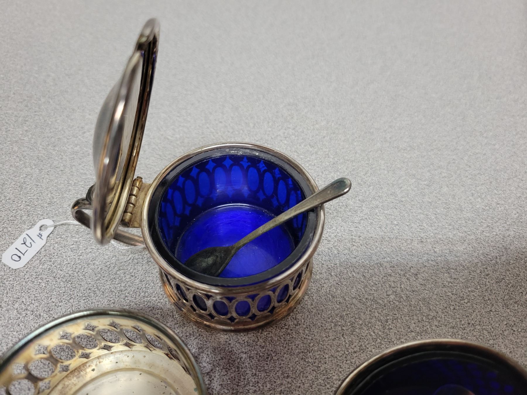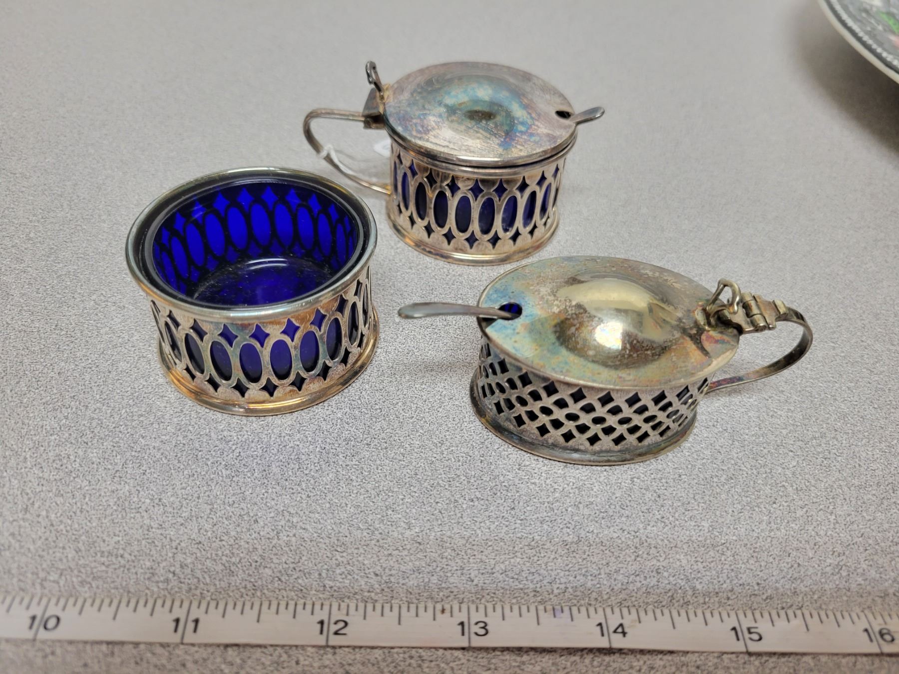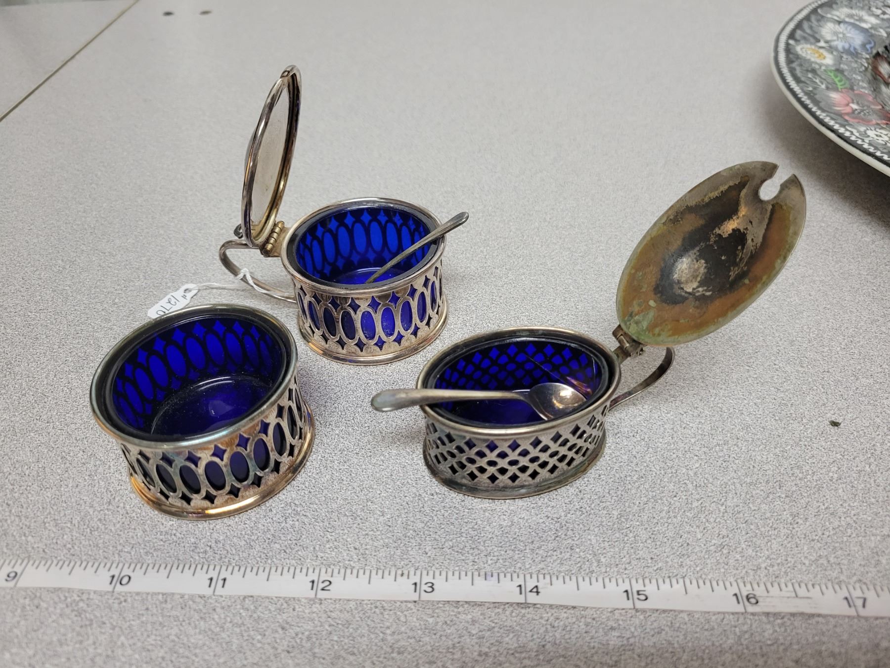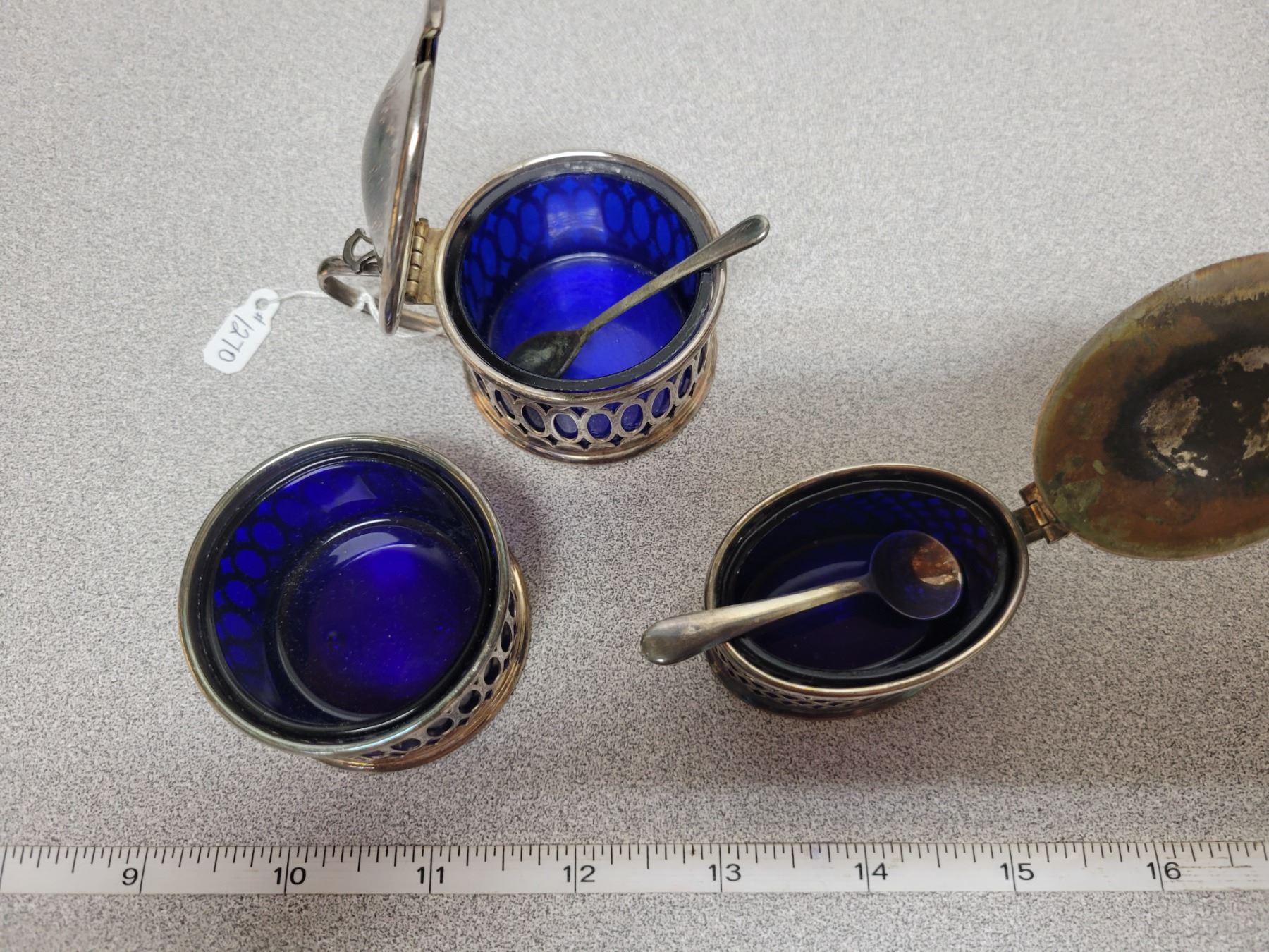 Condiment set with spoons, blue glass liners in silverplate, England
