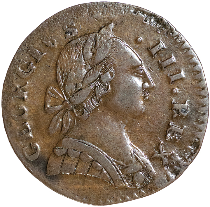 This exceptional coin has superb hard surfaces that retain significant overall natural glossy luster. The exceptional eye appeal is something rarely encountered when discussing a Machins Mill piece, this one ranks among the finest we have seen. Both the obverse and reverse are well centered. The 1788 date is clear and nearly full upon the planchet. The hair detail is sharp and distinct, with virtually every tiny strand highly detailed. There is only the slightest hint of wear the the highpoints, some of the rim edges showing a bit of die slippage at the obverse top and at the left side and bottom on the reverse. The glossy smooth surfaces are truly outstanding for this Machins issue, having perfectly even medium brown natural color on both sides. Listed in Whitman at $3,500 in EF-40 and in the 2012 Red Book on page 64 at $3,750 in AU. This coin is certainly of Condition Census Quality and worthy of the finest of collections.