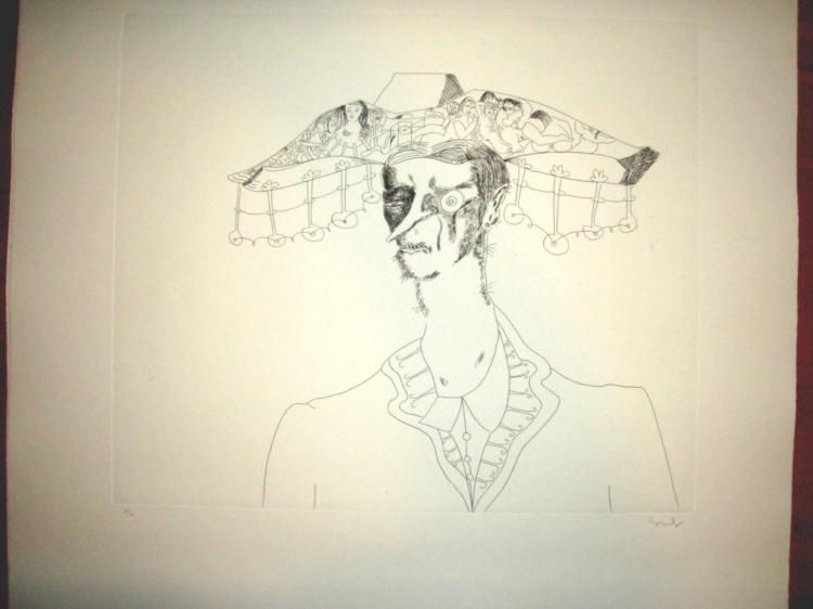 Artist: George CondoTitle: More Sketches of Spain for Miles Davis #4Medium: Etching and Aquatint on Guarro Paper Signature: Hand Signed and Numbered in PencilEdition: Out of 40Date: 1991 * Size: 27.5" x 30.5"Biography * George Condo (1957- ) is as well known for his exquisite, painterly portraits as he is for the bizarre cast of archetypal characters that inhabit them. His subjects are classically posed, dramatically lit, and surrounded by conflated fragments from the history of painting, such as bubbles, glass bottles, drapery, vegetables lifted from the still-life table, and vague empty settings to better project the subject of the picture. In the end, however, the entire world and inner life of his subjects derive completely from his imagination. * Retrieved from: http://rogallery.com/Condo/Condo-bio.html