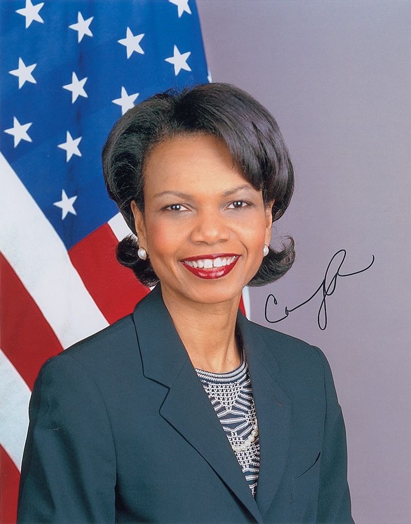 Color satin-finish 11 x 14 portrait of Rice posing in front of the American flag, signed in black felt tip. In very fine condition.