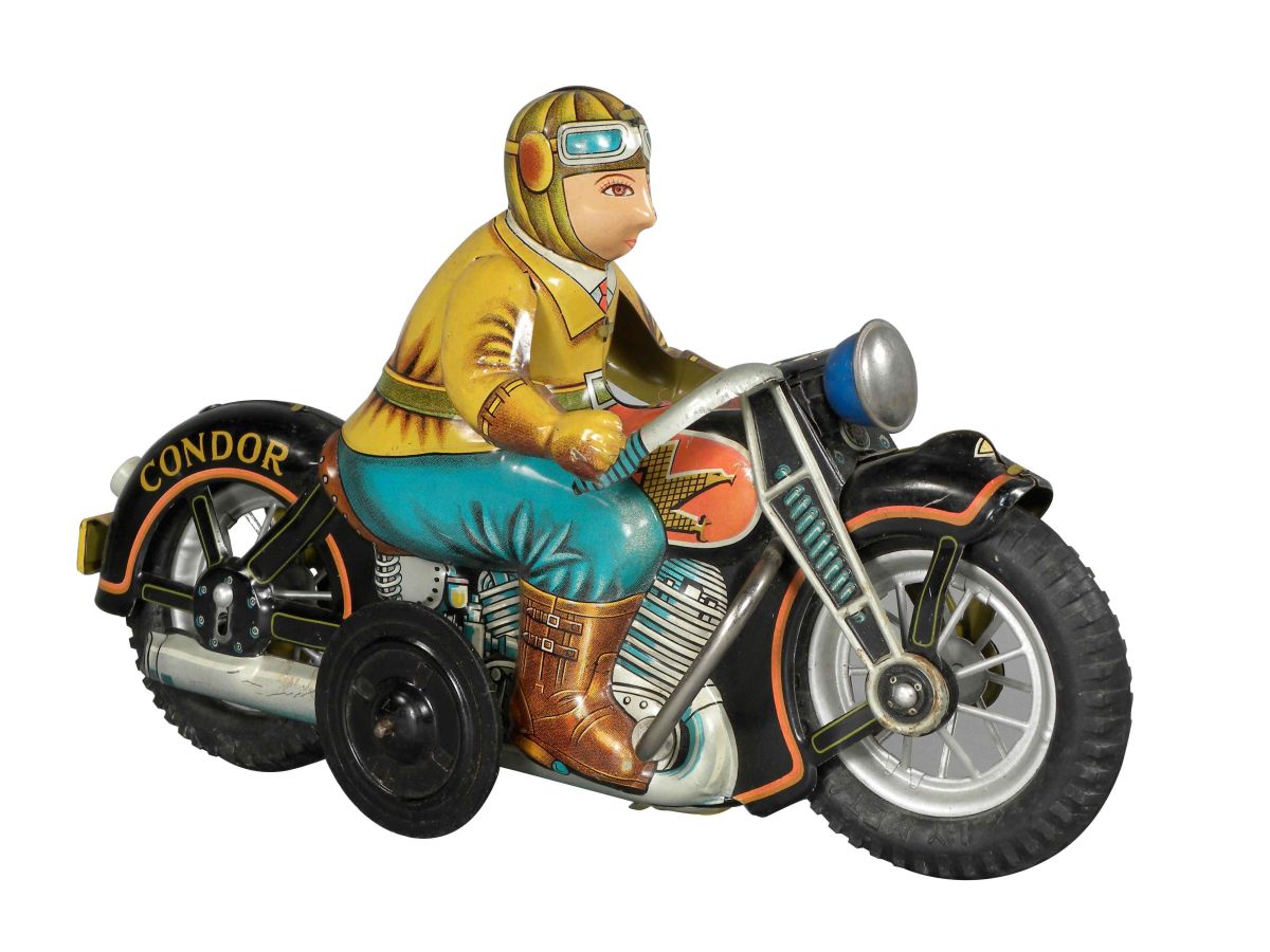 Condor Motorcycle Tin Toy, friction powered. Engine noise. L. Y. Metal Toys, Japan. Excellent condition. 12 inches long.
