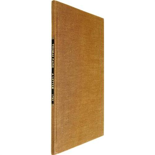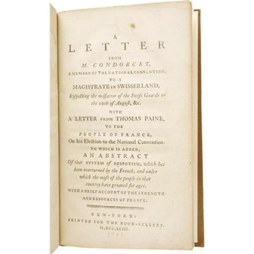 <B>Marie J. A. N. de Caritat, Marquis de Condorcet and Thomas Paine: <I>A Letter from M. Condorcet</B></I></B></I><I>, a Member of the National Convention, to a Magistrate in Swisserland, Respecting the massacre of the Swiss Guards on the 10th of August, &c.</B></I> <B><I>with A Letter from Thomas Paine</B></I></B></I><I>, to the People of France, On his Election to the National Convention</B></I> (New York: Printed for the Booksellers, 1793), first American edition, 29 pages, modern brown cloth with gilt spine titles, 8vo (5" x 8.25"). Very good condition, with toning to the pages and a dark stain on most text leaves.<BR><BR><b>Shipping:</b> Books & Catalogs (<a target="_blank" href="http://www.heritageauctions.com/common/shipping.php">view shipping information</a>)