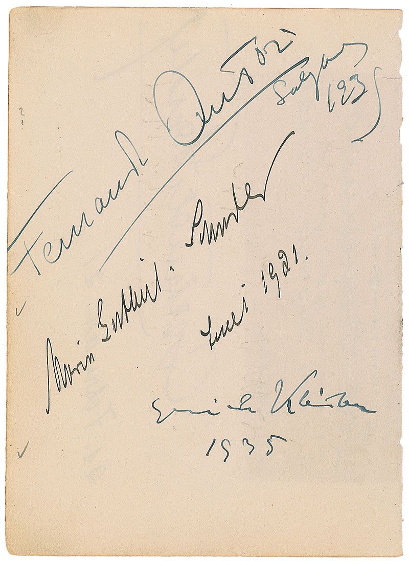 Vintage ink signatures of nine conductors and signers on both sides of two off-white 5 x 7 album pages. Signers include: conductors Bruno Walter, Victor De Sabata, Adrian Boult, and Erich Kleiber; sopranos Gertrude Forstel and Marie Gutheil-Schoder, and three others. In fine condition, with a bit of scattered light toning and soiling.