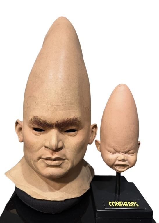 Original adult conehead mask and baby head used in the production of the Steve Barron directed science fiction comedy film 'Coneheads' (1993), where aliens with conical crania crash-land on Earth. The film is based on the NBC Saturday Night Live comedy sketches about aliens stranded on Earth, who have Anglicized their Remulakian surname to "Conehead".