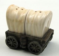 Resin wagon base with ceramic shakers measures 3.5"W x 3.25"H x 2.5"D. There are hairlines in the glazing that make is look cracked.