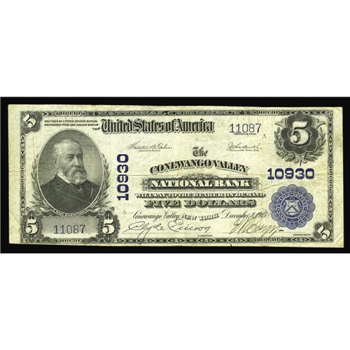 <B>Conewango Valley, NY</B></I> - $5 1902 Plain Back Fr. 606 <B>The Conewango Valley NB</B></I> Ch. # 10930<BR>A just plain scarce note from the only bank to issue in this tiny Cattaraugus County locale. The census shows just four large (and no small) notes reported from here, with this a new piece to that listing. Pleasing <B>Fine-Very Fine.</B></I>