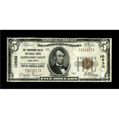 <B>Conewango Valley, NY</B></I> - $5 1929 Ty. 1 <B>The Conewango Valley NB</B></I> Ch. # 10930<BR>This Cattaraugus County issuer is extremely rare, with just four large examples previously reported. This is the discovery note from here for the 1929 series. Any estimate will be pure speculation, as an item of this rarity is worth whatever it takes to acquire. One thing, however, is quite certain, that when the hammer falls tonight, one New York collection will have its stature significantly increased by the addition by the addition of this rare note. Given small issue from here, it is doubtful that another example will surface during the lifetimes of the current generation of New York collectors. In addition to its rarity, this note is also quite attractive, grading an unchallenged <B>Very Fine,</B></I> with some justifiable claims to the next highest grade.<BR><BR><b>Shipping:</b> Coin/Currency (<a target="_blank" href="http://www.heritageauctions.com/common/shipping.php">view shipping information</a>)