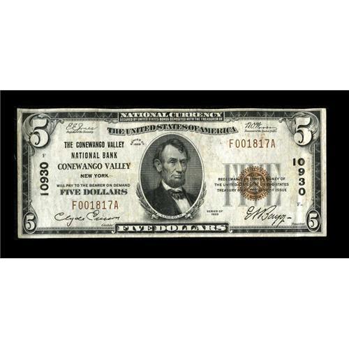 <B>Conewango Valley, NY</B></I> - $5 1929 Ty. 1 <B>The Conewango Valley NB</B></I> Ch. # 10930<BR>From our 2007 FUN Signature sale where it was described, "This Cattaraugus County issuer is extremely rare, with just four large examples previously reported. This is the discovery note from here for the 1929 series. Any estimate will be pure speculation, as an item of this rarity is worth whatever it takes to acquire. One thing, however, is quite certain, that when the hammer falls tonight, one New York collection will have its stature significantly increased by the addition by the addition of this rare note. Given small issue from here, it is doubtful that another example will surface during the lifetimes of the current generation of New York collectors. In addition to its rarity, this note is also quite attractive, grading an unchallenged <B>Very Fine,</B></I> with some justifiable claims to the next highest grade."<BR><BR><b>Shipping:</b> Coins & Currency (<a target="_blank" href="http://www.heritageauctions.com/common/shipping.php">view shipping information</a>)