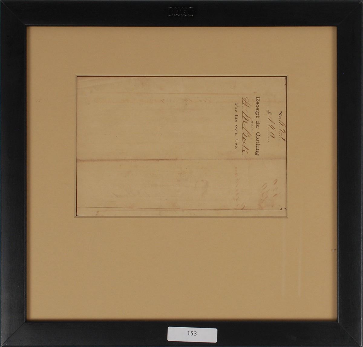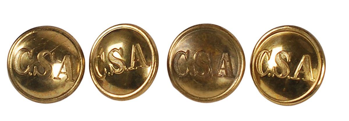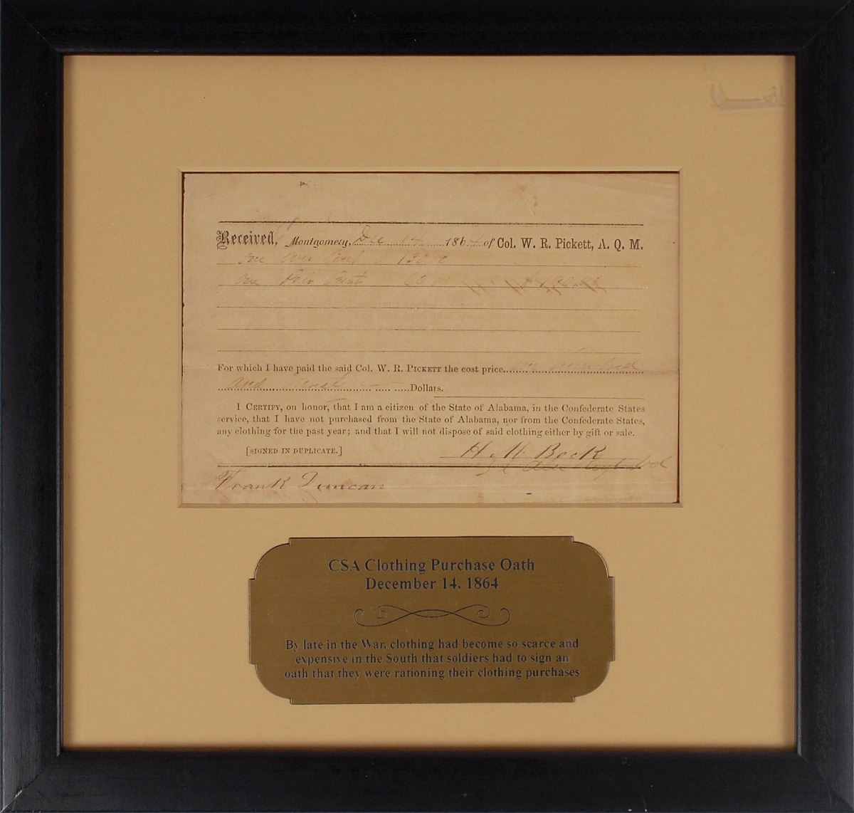 Two items: a partly-printed Confederate clothing oath signed “H. M. Block,” December 14, 1864, confirming receipt of “One Over Coat” and “One Pair Pants,” and certifies that he is a citizen of Alabama and has not purchased any other clothing in the previous year, matted and framed with a descriptive plaque; and a collection of four die-struck, domed buttons with “Superior Quality” back markings and intact wire loops, cataloged as no. CS81B in Record of American Uniform and Historical Buttons by A. H. Albert. In overall very good to fine condition.