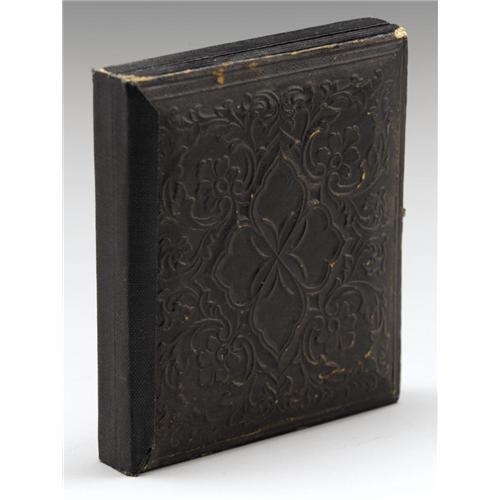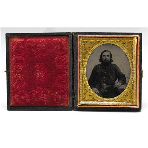 <B>Confederate 1/6th Plate Ambrotype</B></I> depicting a rebel soldier ready for war. This fellow, likely a western volunteer, is outfitted in a distinctively Southern battle shirt and wears a belt rig secured by a classic Confederate frame buckle. The hilt of a side knife is visible as well. Some minor emulsion irregularities along the edge, one scratch in the field and tape along the case hinge. Overall excellent contracts and in very good condition.<BR><BR><b>Shipping:</b> Large Flat (<a target="_blank" href="http://www.heritageauctions.com/common/shipping.php">view shipping information</a>)