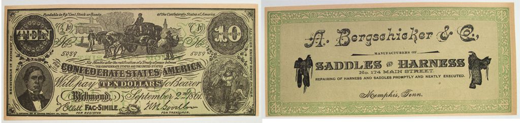 Confederate States of America Ten Dollars. A Bergschicker & Co. of Memphis, Tenn. Ad on back. Excellent condition