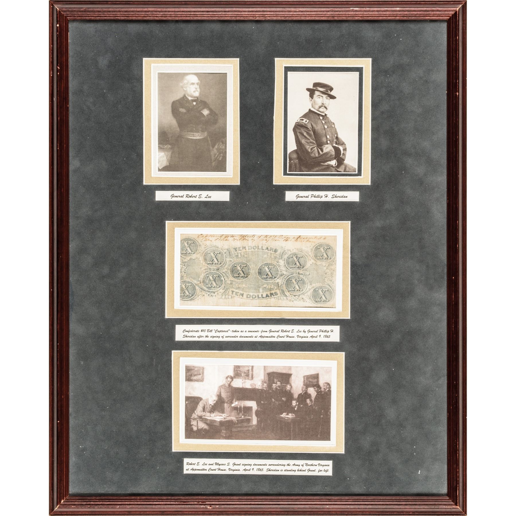 Frame is double sided. Front shows the signed note in center with images of Generals Lee and Sheridan at top, and an rendering printed image of Generals Lee and Grant signing the Confederate Army’s surrendering documents at the Appomatox Court House. Back side of the framed display shows the face side of the $10 CSA note and the letter of provenance. A beautiful display, unique and ready to present. Ex: EAHA Auction March 18, 1997, Lot 726 where it sold for $5,290. A historic American Civil War and numismatic related item with provenance and connection to CSA Major General Robert E. Lee and Union Major General Philip Sheridan... “Captured from Effects of Rob't. E. Lee”.